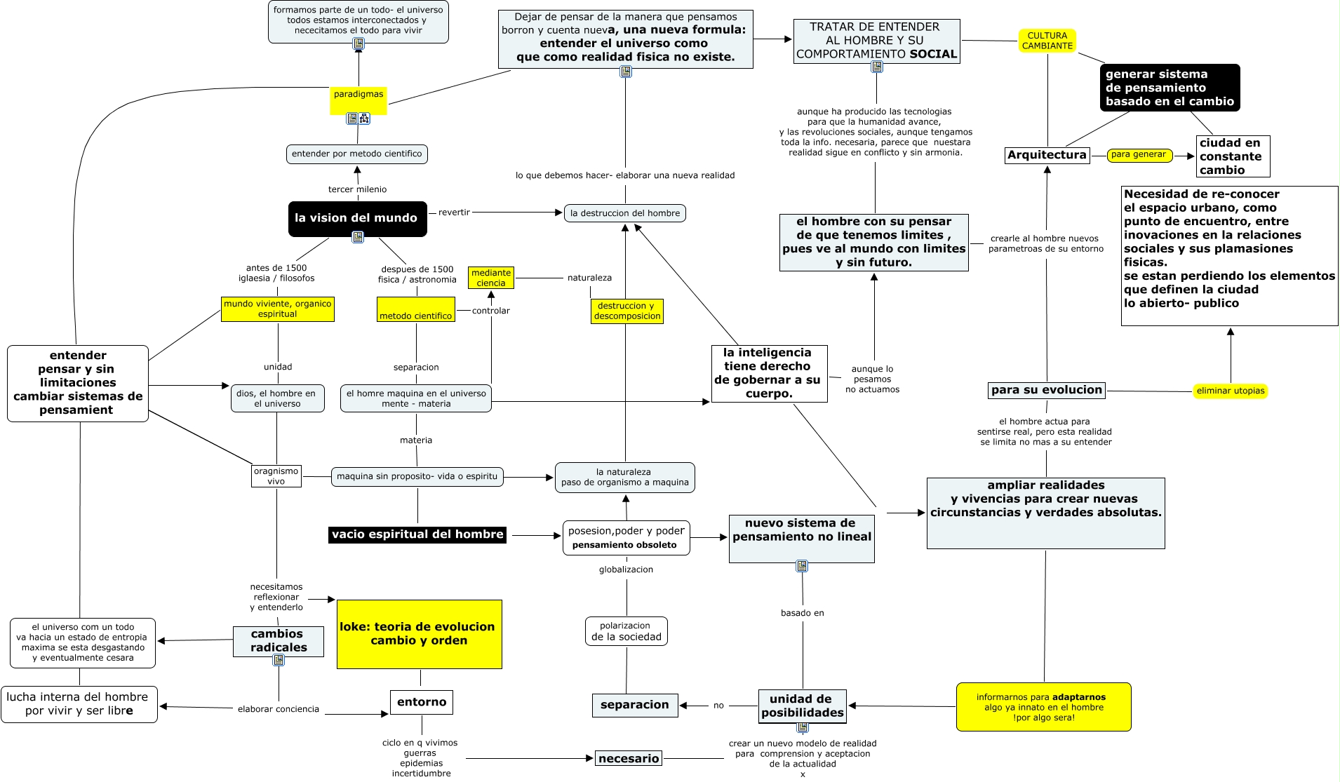 FERNANDA, para su evolucion el hombre actua para sentirse real, pero esta realidad se limita no mas a su entender ampliar realidades y vivencias para crear nuevas circunstancias y verdades absolutas., la vision del mundo tercer milenio entender por metodo cientifico, cambios radicales elaborar conciencia lucha interna del hombre por vivir y ser libre, unidad de posibilidades no separacion, oragnismo vivo cuido entender pensar y sin limitaciones cambiar sistemas de pensamiento, el hombre con su pensar de que tenemos limites , pues ve al mundo con limites y sin futuro. crearle al hombre nuevos parametroas de su entorno Arquitectura, Dejar de pensar de la manera que pensamos borron y cuenta nueva, una nueva formula: entender el universo como que como realidad fisica no existe. paradigmas formamos parte de un todo- el universo todos estamos interconectados y nececitamos el todo para vivir, metodo cientifico separacion el homre maquina en el universo mente - materia, Arquitectura sistema de pensamiento ciudad en constante cambio, entorno ciclo en q vivimos guerras epidemias incertidumbre necesario