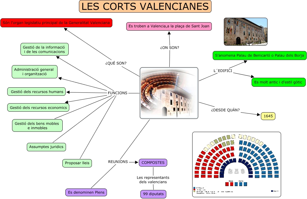 Este mapa conceptual tiene información relacionada a: CORTS (Marta), FUNCIONS Gestió dels recursos economics, L´EDIFICI Es molt antic i d'estil gòtic, FUNCIONS Proposar lleis, REUNIONS COMPOSTES, ¿ON SON? Es troben a Valencia,a la plaça de Sant Joan, REUNIONS Es denominen Plens, FUNCIONS Administració general i organització, ¿DESDE QUÀN? 1645, FUNCIONS Gestió de la informació i de les comunicacions, FUNCIONS Assumptes juridics, L´EDIFICI S'anomena Palau de Benicarló o Palau dels Borja, COMPOSTES Les representants dels valencians 99 diputats, FUNCIONS Gestió dels recursos humans, ¿QUÉ SON? Són l'organ legislatiu principal de la Generalitat Valenciana, FUNCIONS Gestió dels bens mobles e inmobles