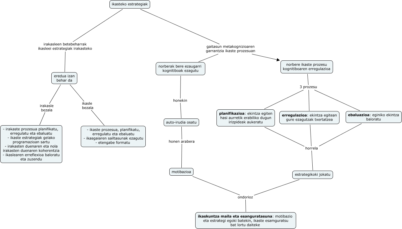 This Concept Map, created with IHMC CmapTools, has information related to: ander-hegoa, erregulazioa: ekintza egitean gure ezagutzak txertatzea horrela estrategikoki jokatu, eredua izan behar da irakasle bezala - irakaste prozesua planifikatu, erregulatu eta ebaluatu - ikaste estrategiak gelako programazioan sartu - irakasten duenaren eta nola irakasten duenaren koherentzia - ikaslearen erreflexioa baloratu eta zuzendu, norbere ikaste prozesu kognitiboaren erregulazioa 3 prozesu ebaluazioa: eginiko ekintza baloratu, motibazioa ondorioz ikaskuntza maila eta esanguratasuna: motibazio eta estrategi egoki batekin, ikaste esamguratsu bat lortu daiteke, norberak bere ezaugarri kognitiboak ezagutu honekin auto-irudia osatu, auto-irudia osatu honen arabera motibazioa, ikasteko estrategiak irakasleen betebeharrak ikasleei estrategiak irakasteko eredua izan behar da, ikasteko estrategiak gaitasun metakognizioaren garrantzia ikaste prozesuan norberak bere ezaugarri kognitiboak ezagutu, eredua izan behar da ikasle bezala - ikaste prozesua, planifikatu, erregulatu eta ebaluatu - ikasgaiaren sailtasunak ezagutu - etengabe formatu, ikasteko estrategiak gaitasun metakognizioaren garrantzia ikaste prozesuan norbere ikaste prozesu kognitiboaren erregulazioa, estrategikoki jokatu ondorioz ikaskuntza maila eta esanguratasuna: motibazio eta estrategi egoki batekin, ikaste esamguratsu bat lortu daiteke, norbere ikaste prozesu kognitiboaren erregulazioa 3 prozesu planifikazioa: ekintza egiten hasi aurretik erabiliko dugun irizpideak aukeratu, norbere ikaste prozesu kognitiboaren erregulazioa 3 prozesu erregulazioa: ekintza egitean gure ezagutzak txertatzea, ebaluazioa: eginiko ekintza baloratu horrela estrategikoki jokatu, planifikazioa: ekintza egiten hasi aurretik erabiliko dugun irizpideak aukeratu horrela estrategikoki jokatu