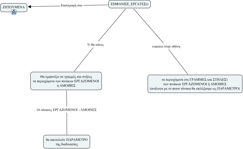 This Concept Map, created with IHMC CmapTools, has information related to: emfanise_ergates, ΕΜΦΑΝΙΣΕ_ΕΡΓΑΤΕΣ() Τι θα κάνει; Θα εμφανίζει σε γραμμές και στήλες τα περιεχόμενα των πινάκων ΕΡΓΑΖΟΜΕΝΟΙ ή ΑΜΟΙΒΕΣ, ΕΜΦΑΝΙΣΕ_ΕΡΓΑΤΕΣ() Επιστροφή στο ΖΗΤΟΥΜΕΝΑ, ΕΜΦΑΝΙΣΕ_ΕΡΓΑΤΕΣ() τυπώνει στην οθόνη τα περιεχόμενα (σε ΓΡΑΜΜΕΣ και ΣΤΗΛΕΣ) των πινάκων ΕΡΓΑΖΟΜΕΝΟΙ ή ΑΜΟΙΒΕΣ (ανάλογα με το ποιον πίνακα θα επιλέξουμε ως ΠΑΡΑΜΕΤΡΟ), Θα εμφανίζει σε γραμμές και στήλες τα περιεχόμενα των πινάκων ΕΡΓΑΖΟΜΕΝΟΙ ή ΑΜΟΙΒΕΣ Οι πίνακες ΕΡΓΑΖΟΜΕΝΟΙ - ΑΜΟΙΝΕΣ θα αποτελούν ΠΑΡΑΜΕΤΡΟ της διαδικασίας