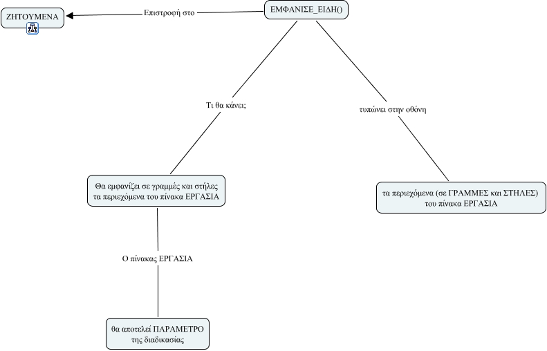 This Concept Map, created with IHMC CmapTools, has information related to: emfanise_eidh, ΕΜΦΑΝΙΣΕ_ΕΙΔΗ() Τι θα κάνει; Θα εμφανίζει σε γραμμές και στήλες τα περιεχόμενα του πίνακα ΕΡΓΑΣIΑ, ΕΜΦΑΝΙΣΕ_ΕΙΔΗ() Επιστροφή στο ΖΗΤΟΥΜΕΝΑ, ΕΜΦΑΝΙΣΕ_ΕΙΔΗ() τυπώνει στην οθόνη τα περιεχόμενα (σε ΓΡΑΜΜΕΣ και ΣΤΗΛΕΣ) του πίνακα ΕΡΓΑΣΙΑ, Θα εμφανίζει σε γραμμές και στήλες τα περιεχόμενα του πίνακα ΕΡΓΑΣIΑ Ο πίνακας ΕΡΓΑΣIΑ θα αποτελεί ΠΑΡΑΜΕΤΡΟ της διαδικασίας