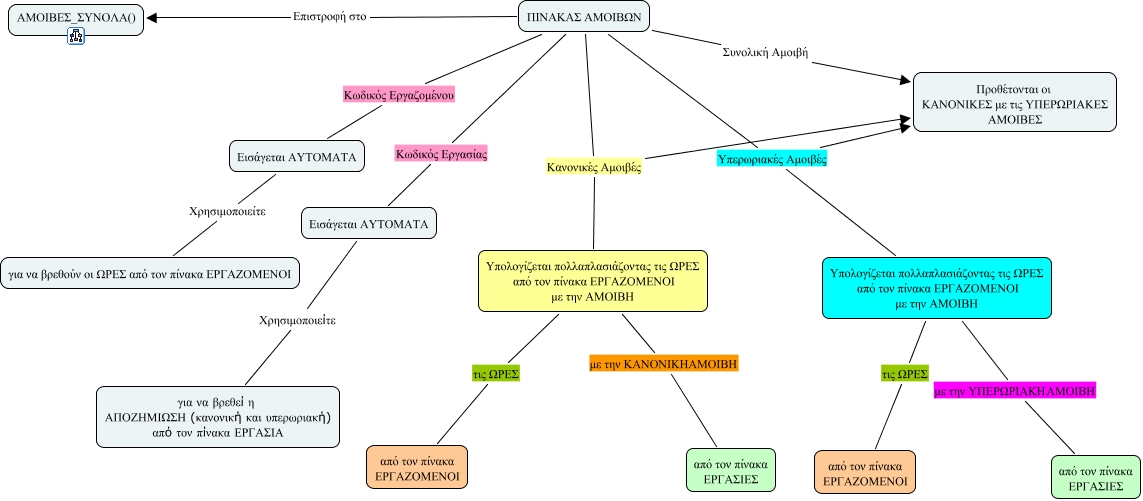 This Concept Map, created with IHMC CmapTools, has information related to: amoibes_sunola_procedure, Υπολογίζεται πολλαπλασιάζοντας τις ΩΡΕΣ από τον πίνακα ΕΡΓΑΖΟΜΕΝΟΙ με την ΑΜΟΙΒΗ τις ΩΡΕΣ από τον πίνακα ΕΡΓΑΖΟΜΕΝΟΙ, ΠΙΝΑΚΑΣ ΑΜΟΙΒΩΝ Επιστροφή στο ΑΜΟΙΒΕΣ_ΣΥΝΟΛΑ(), Υπολογίζεται πολλαπλασιάζοντας τις ΩΡΕΣ από τον πίνακα ΕΡΓΑΖΟΜΕΝΟΙ με την ΑΜΟΙΒΗ τις ΩΡΕΣ από τον πίνακα ΕΡΓΑΖΟΜΕΝΟΙ, Εισάγεται ΑΥΤΟΜΑΤΑ Χρησιμοποιείτε για να βρεθούν οι ΩΡΕΣ από τον πίνακα ΕΡΓΑΖΟΜΕΝΟΙ, ΠΙΝΑΚΑΣ ΑΜΟΙΒΩΝ Κανονικές Αμοιβές Υπολογίζεται πολλαπλασιάζοντας τις ΩΡΕΣ από τον πίνακα ΕΡΓΑΖΟΜΕΝΟΙ με την ΑΜΟΙΒΗ, ΠΙΝΑΚΑΣ ΑΜΟΙΒΩΝ Κωδικός Εργαζομένου Εισάγεται ΑΥΤΟΜΑΤΑ, ΠΙΝΑΚΑΣ ΑΜΟΙΒΩΝ Κανονικές Αμοιβές Προθέτονται οι ΚΑΝΟΝΙΚΕΣ με τις ΥΠΕΡΩΡΙΑΚΕΣ ΑΜΟΙΒΕΣ, ΠΙΝΑΚΑΣ ΑΜΟΙΒΩΝ Υπερωριακές Αμοιβές Προθέτονται οι ΚΑΝΟΝΙΚΕΣ με τις ΥΠΕΡΩΡΙΑΚΕΣ ΑΜΟΙΒΕΣ, ΠΙΝΑΚΑΣ ΑΜΟΙΒΩΝ Υπερωριακές Αμοιβές Υπολογίζεται πολλαπλασιάζοντας τις ΩΡΕΣ από τον πίνακα ΕΡΓΑΖΟΜΕΝΟΙ με την ΑΜΟΙΒΗ, Εισάγεται ΑΥΤΟΜΑΤΑ Χρησιμοποιείτε για να βρεθεί η ΑΠΟΖΗΜΙΩΣΗ (κανονική και υπερωριακή) από τον πίνακα ΕΡΓΑΣΙΑ, Υπολογίζεται πολλαπλασιάζοντας τις ΩΡΕΣ από τον πίνακα ΕΡΓΑΖΟΜΕΝΟΙ με την ΑΜΟΙΒΗ με την ΚΑΝΟΝΙΚΗΑΜΟΙΒΗ από τον πίνακα ΕΡΓΑΣΙΕΣ, ΠΙΝΑΚΑΣ ΑΜΟΙΒΩΝ Κωδικός Εργασίας Εισάγεται ΑΥΤΟΜΑΤΑ, Υπολογίζεται πολλαπλασιάζοντας τις ΩΡΕΣ από τον πίνακα ΕΡΓΑΖΟΜΕΝΟΙ με την ΑΜΟΙΒΗ με την ΥΠΕΡΩΡΙΑΚΉΑΜΟΙΒΗ από τον πίνακα ΕΡΓΑΣΙΕΣ, ΠΙΝΑΚΑΣ ΑΜΟΙΒΩΝ Συνολική Αμοιβή Προθέτονται οι ΚΑΝΟΝΙΚΕΣ με τις ΥΠΕΡΩΡΙΑΚΕΣ ΑΜΟΙΒΕΣ