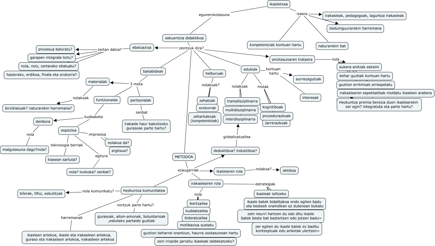 This Concept Map has information related to: nai, hezkuntza komunitatea harremanak ikasleen artekoa, ikasle eta irakasleen artekoa, guraso eta irakasleen artekoa, irakasleen artekoa, funtzionalak kudeaketa espazioa, ikaslearen rola nolakoa? aktiboa, irakaslearen rola estrategiak ikasleak isiltzeko, sekuentzia didaktikoa zeintzuk dira? helburuak, ebaluazioa zertan datza? nola, noiz, zertarako ebaluatu?, irakaslearen rola nola ikertzailea, ikastetxea izaera konpetentziak kontuan hartu, irakaslearen rola estrategiak zein neurri hartzen du edo ditu ikasle batek beste bat baztertzen edo jotzen badu=, sekuentzia didaktikoa zeintzuk dira? baliabideak