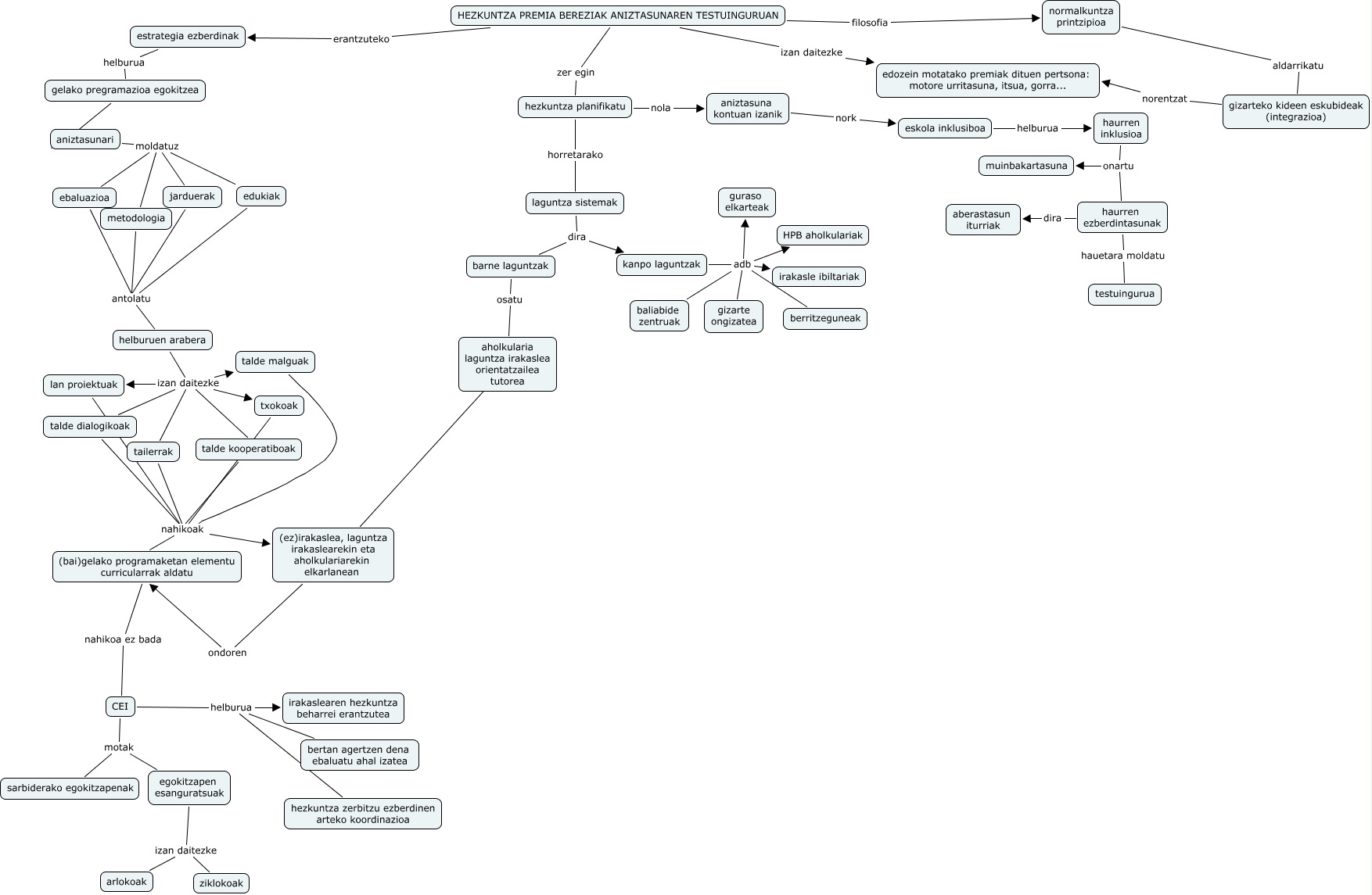 IHMC CmapTools-ekin sortu den kontzeptu-mapa honek honi buruzko informazioa du: hb map lar, gelako pregramazioa egokitzea ???? aniztasunari, talde malguak nahikoak (ez)irakaslea, laguntza irakaslearekin eta aholkulariarekin elkarlanean, CEI helburua hezkuntza zerbitzu ezberdinen arteko koordinazioa, laguntza sistemak dira barne laguntzak, hezkuntza planifikatu nola aniztasuna kontuan izanik, CEI helburua irakaslearen hezkuntza beharrei erantzutea, ebaluazioa antolatu helburuen arabera, HEZKUNTZA PREMIA BEREZIAK ANIZTASUNAREN TESTUINGURUAN erantzuteko estrategia ezberdinak, egokitzapen esanguratsuak izan daitezke ziklokoak, aniztasunari moldatuz ebaluazioa, helburuen arabera izan daitezke txokoak, haurren inklusioa onartu muinbakartasuna, kanpo laguntzak adb irakasle ibiltariak, kanpo laguntzak adb baliabide zentruak, talde malguak nahikoak (bai)gelako programaketan elementu curricularrak aldatu, aniztasunari moldatuz edukiak, kanpo laguntzak adb HPB aholkulariak, haurren ezberdintasunak hauetara moldatu testuingurua, HEZKUNTZA PREMIA BEREZIAK ANIZTASUNAREN TESTUINGURUAN filosofia normalkuntza printzipioa, normalkuntza printzipioa aldarrikatu gizarteko kideen eskubideak (integrazioa)