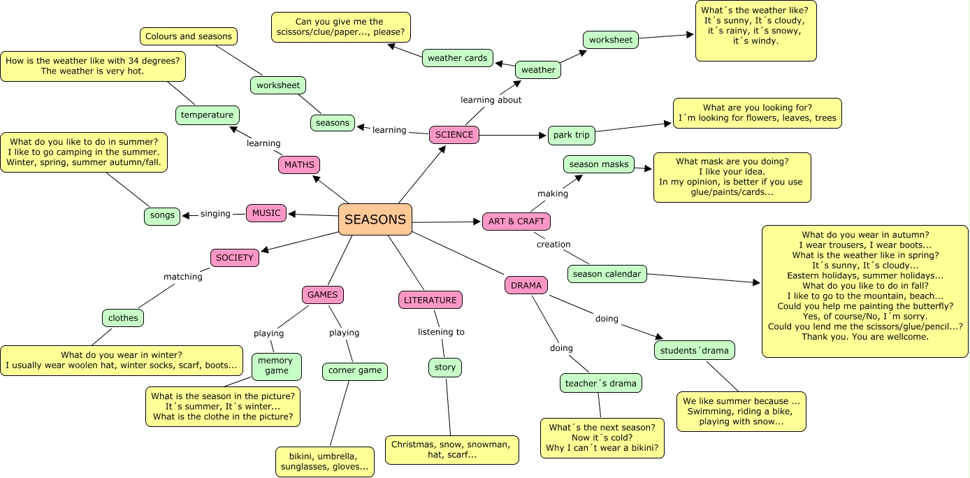 This Concept Map has information related to: Paula Etxebeste SEASONS 2, MUSIC singing songs, corner game ???? bikini, umbrella, sunglasses, gloves..., SEASONS ???? MATHS, weather cards ???? Can you give me the scissors/clue/paper..., please?, season calendar ???? What do you wear in autumn? I wear trousers, I wear boots... What is the weather like in spring? It´s sunny, It´s cloudy... Eastern holidays, summer holidays... What do you like to do in fall? I like to go to the mountain, beach... Could you help me painting the butterfly? Yes, of course/No, I´m sorry. Could you lend me the scissors/glue/pencil...? Thank you. You are wellcome., SEASONS ???? DRAMA, teacher´s drama ???? What´s the next season? Now it´s cold? Why I can´t wear a bikini?, memory game ???? What is the season in the picture? It´s summer, It´s winter... What is the clothe in the picture?, SEASONS ???? SCIENCE, SEASONS ???? ART & CRAFT