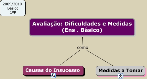 Esse mapa conceitual, produzido no IHMC CmapTools, tem a informação relacionada a: Aval -prob med 20092010_1, Avaliação: Dificuldades e Medidas (Ens . Básico) como Medidas a Tomar, Avaliação: Dificuldades e Medidas (Ens . Básico) como Causas do Insucesso