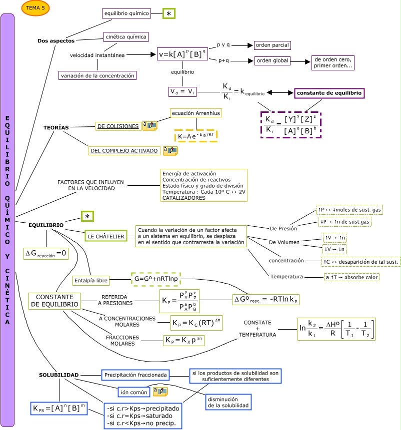 -si c.r<Kps→no precip. </mtext> </math>, E Q U I L I B R I O Q U Í M I C O Y C I N É T I C A SOLUBILIDAD Precipitación fraccionada, Cuando la variación de un factor afecta a un sistema en equilibrio, se desplaza en el sentido que contrarresta la variación De Volumen ↓V → ↓n, Cuando la variación de un factor afecta a un sistema en equilibrio, se desplaza en el sentido que contrarresta la variación De Presión ↑P ↔ ↓moles de sust. gas, Precipitación fraccionada ???? si los productos de solubilidad son suficientemente diferentes, E Q U I L I B R I O Q U Í M I C O Y C I N É T I C A EQUILIBRIO CONSTANTE DE EQUILIBRIO, ecuación Arrenhius ???? <math xmlns="http://www.w3.org/1998/Math/MathML"> <mrow> <mtext> K=A </mtext> <mmultiscripts> <mtext> e </mtext> <none/> <mrow> <mtext> - </mtext> <mmultiscripts> <mtext> E </mtext> <mtext> a </mtext> <none/> </mmultiscripts> <mtext> /RT </mtext> </mrow> </mmultiscripts> </mrow> </math>, Entalpía libre ???? G=Gº+nRTlnp, E Q U I L I B R I O Q U Í M I C O Y C I N É T I C A SOLUBILIDAD ión común, G=Gº+nRTlnp ???? <math xmlns="http://www.w3.org/1998/Math/MathML"> <mrow> <mtext> Δ </mtext> <mmultiscripts> <mtext> Gº </mtext> <mtext> reac. </mtext> <none/> </mmultiscripts> <mtext> = -RTln </mtext> <mmultiscripts> <mtext> k </mtext> <mtext> p </mtext> <none/> </mmultiscripts> </mrow> </math>, E Q U I L I B R I O Q U Í M I C O Y C I N É T I C A EQUILIBRIO <math xmlns="http://www.w3.org/1998/Math/MathML"> <mrow> <mtext> Δ </mtext> <mmultiscripts> <mtext> G </mtext> <mtext> reacción </mtext> <none/> </mmultiscripts> <mtext> =0 </mtext> </mrow> </math>, E Q U I L I B R I O Q U Í M I C O Y C I N É T I C A TEORÍAS DE COLISIONES, <math xmlns="http://www.w3.org/1998/Math/MathML"> <mtext> v=k[ </mtext> <mmultiscripts> <mtext> A] </mtext> <none/> <mtext> p </mtext> </mmultiscripts> <mtext> [ </mtext> <mmultiscripts> <mtext> B] </mtext> <none/> <mtext> q </mtext> </mmultiscripts> </math> equilibrio <math xmlns="http://www.w3.org/1998/Math/MathML"> <mmultiscripts> <mtext> V </mtext> <mtext> d </mtext> <none/> </mmultiscripts> <mtext> = </mtext> <mmultiscripts> <mtext> V </mtext> <mtext> i </mtext> <none/> </mmultiscripts> </math>, <math xmlns="http://www.w3.org/1998/Math/MathML"> <mtext> v=k[ </mtext> <mmultiscripts> <mtext> A] </mtext> <none/> <mtext> p </mtext> </mmultiscripts> <mtext> [ </mtext> <mmultiscripts> <mtext> B] </mtext> <none/> <mtext> q </mtext> </mmultiscripts> </math> p y q orden parcial, ecuación Arrenhius ???? DE COLISIONES, equilibrio químico ???? ∗, LE CHÂTELIER ???? Cuando la variación de un factor afecta a un sistema en equilibrio, se desplaza en el sentido que contrarresta la variación, <math xmlns="http://www.w3.org/1998/Math/MathML"> <mmultiscripts> <mtext> V </mtext> <mtext> d </mtext> <none/> </mmultiscripts> <mtext> = </mtext> <mmultiscripts> <mtext> V </mtext> <mtext> i </mtext> <none/> </mmultiscripts> </math> <math xmlns="http://www.w3.org/1998/Math/MathML"> <mrow> <mfrac> <mmultiscripts> <mtext> K </mtext> <mtext> d </mtext> <none/> </mmultiscripts> <mmultiscripts> <mtext> K </mtext> <mtext> i </mtext> <none/> </mmultiscripts> </mfrac> <mtext> = </mtext> <mmultiscripts> <mtext> k </mtext> <mtext> equilibrio </mtext> <none/> </mmultiscripts> </mrow> </math> constante de equilibrio, Cuando la variación de un factor afecta a un sistema en equilibrio, se desplaza en el sentido que contrarresta la variación De Volumen ↑V → ↑n, E Q U I L I B R I O Q U Í M I C O Y C I N É T I C A SOLUBILIDAD <math xmlns="http://www.w3.org/1998/Math/MathML"> <mtext> -si c.r>Kps→precipitado