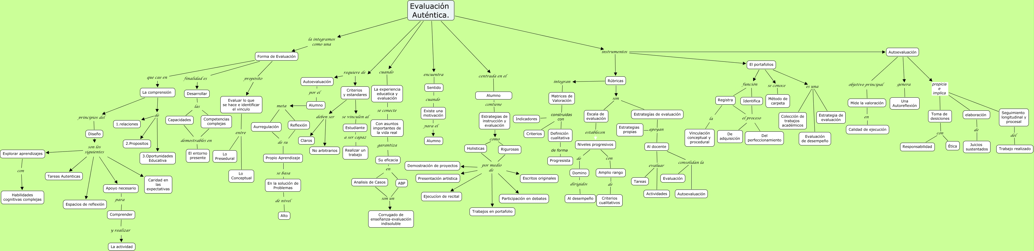 Evaluación Autentica, Autoevaluación por el Alumno, Holisticas por medio de Trabajos en portafolio, Domino dirigidos Al desempeño, Estudiante a ser capaz Realizar un trabajo, Al docente evaluar Tareas, Amplio rango de Criterios cualitativos, Holisticas por medio de Demostración de proyectos, Sentido cuando Existe una motivación, Diseño son los siguientes Apoyo necesario, Evaluación Auténtica. instrumentos Rúbricas