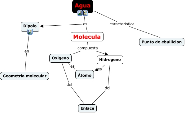 Questa Mappa Concettuale ha informazioni correlate a: Qumica del agua, Oxigeno del Enlace, Molecula compuesta Hidrogeno, Molecula compuesta Oxigeno, Dipolo en Geometria molecular, Agua es Molecula, Oxigeno es Átomo, Agua caracteristica Punto de ebullicion, Hidrogeno es Átomo, Agua es Dipolo, Hidrogeno del Enlace