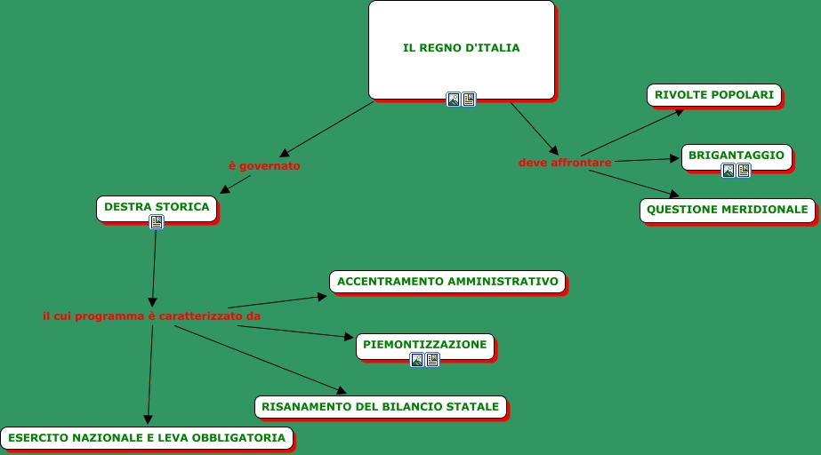 Questa Mappa Concettuale ha informazioni correlate a: regno d-Italia2, DESTRA STORICA il cui programma è caratterizzato da ESERCITO NAZIONALE E LEVA OBBLIGATORIA, IL REGNO D'ITALIA è governato DESTRA STORICA, DESTRA STORICA il cui programma è caratterizzato da RISANAMENTO DEL BILANCIO STATALE, DESTRA STORICA il cui programma è caratterizzato da ACCENTRAMENTO AMMINISTRATIVO, DESTRA STORICA il cui programma è caratterizzato da PIEMONTIZZAZIONE, IL REGNO D'ITALIA deve affrontare RIVOLTE POPOLARI, IL REGNO D'ITALIA deve affrontare BRIGANTAGGIO, IL REGNO D'ITALIA deve affrontare QUESTIONE MERIDIONALE
