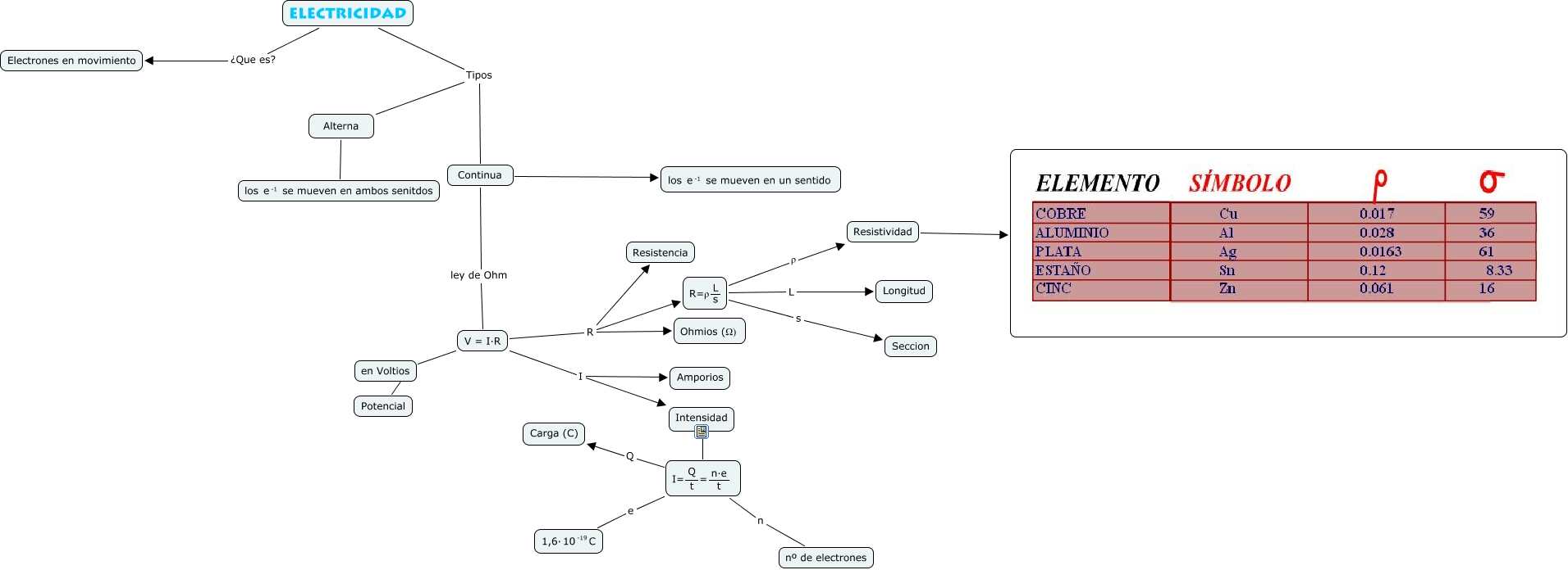 Este mapa conceptual tiene información relacionada a: Lydia Cortijo, <math xmlns="http://www.w3.org/1998/Math/MathML"> <mrow> <mtext> R=ρ </mtext> <mfrac> <mtext> L </mtext> <mtext> s </mtext> </mfrac> </mrow> </math> ρ Resistividad, <math xmlns="http://www.w3.org/1998/Math/MathML"> <mrow> <mtext> I= </mtext> <mfrac> <mtext> Q </mtext> <mtext> t </mtext> </mfrac> <mtext> = </mtext> <mfrac> <mtext> n·e </mtext> <mtext> t </mtext> </mfrac> <mtext> </mtext> </mrow> </math> e <math xmlns="http://www.w3.org/1998/Math/MathML"> <mrow> <mtext> 1,6· </mtext> <mmultiscripts> <mtext> 10 </mtext> <none/> <mtext> -19 </mtext> </mmultiscripts> <mtext> C </mtext> </mrow> </math>, Alterna <math xmlns="http://www.w3.org/1998/Math/MathML"> <mtext> los </mtext> <mmultiscripts> <mtext> e </mtext> <none/> <mtext> -1 </mtext> </mmultiscripts> <mtext> se mueven en ambos senitdos </mtext> </math>, <math xmlns="http://www.w3.org/1998/Math/MathML"> <mrow> <mtext> R=ρ </mtext> <mfrac> <mtext> L </mtext> <mtext> s </mtext> </mfrac> </mrow> </math> L Longitud, V = I·R V en Voltios, V = I·R I Intensidad, V = I·R R <math xmlns="http://www.w3.org/1998/Math/MathML"> <mrow> <mtext> R=ρ </mtext> <mfrac> <mtext> L </mtext> <mtext> s </mtext> </mfrac> </mrow> </math>, <math xmlns="http://www.w3.org/1998/Math/MathML"> <mrow> <mtext> I= </mtext> <mfrac> <mtext> Q </mtext> <mtext> t </mtext> </mfrac> <mtext> = </mtext> <mfrac> <mtext> n·e </mtext> <mtext> t </mtext> </mfrac> <mtext> </mtext> </mrow> </math> n nº de electrones, V = I·R V Potencial, <math xmlns="http://www.w3.org/1998/Math/MathML"> <mrow> <mtext> I= </mtext> <mfrac> <mtext> Q </mtext> <mtext> t </mtext> </mfrac> <mtext> = </mtext> <mfrac> <mtext> n·e </mtext> <mtext> t </mtext> </mfrac> <mtext> </mtext> </mrow> </math> Q Carga (C), ELECTRICIDAD Tipos Continua, Intensidad <math xmlns="http://www.w3.org/1998/Math/MathML"> <mrow> <mtext> I= </mtext> <mfrac> <mtext> Q </mtext> <mtext> t </mtext> </mfrac> <mtext> = </mtext> <mfrac> <mtext> n·e </mtext> <mtext> t </mtext> </mfrac> <mtext> </mtext> </mrow> </math>, V = I·R R Ohmios (Ω), Continua <math xmlns="http://www.w3.org/1998/Math/MathML"> <mrow> <mtext> los </mtext> <mmultiscripts> <mtext> e </mtext> <none/> <mtext> -1 </mtext> </mmultiscripts> <mtext> se mueven en un sentido </mtext> </mrow> </math>, <math xmlns="http://www.w3.org/1998/Math/MathML"> <mrow> <mtext> R=ρ </mtext> <mfrac> <mtext> L </mtext> <mtext> s </mtext> </mfrac> </mrow> </math> s Seccion, Continua ley de Ohm V = I·R, Resistividad, V = I·R I Amporios, ELECTRICIDAD Tipos Alterna, ELECTRICIDAD ¿Que es? Electrones en movimiento