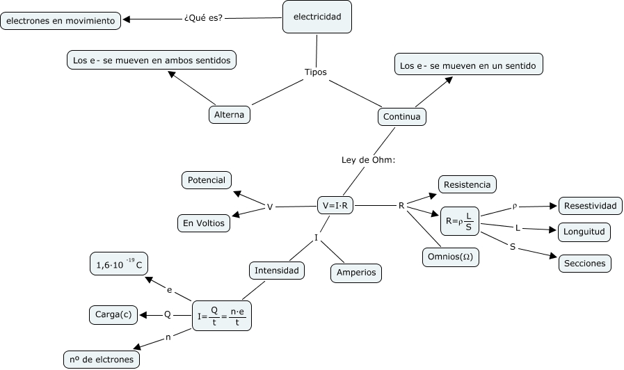Este mapa conceptual tiene información relacionada a: Celia Rico, <math xmlns="http://www.w3.org/1998/Math/MathML"> <mrow> <mtext> R=ρ </mtext> <mfrac> <mtext> L </mtext> <mtext> S </mtext> </mfrac> </mrow> </math> S Secciones, V=I·R I Intensidad, V=I·R R Omnios(Ω), Continua Ley de Ohm: V=I·R, <math xmlns="http://www.w3.org/1998/Math/MathML"> <mrow> <mtext> I= </mtext> <mfrac> <mtext> Q </mtext> <mtext> t </mtext> </mfrac> <mtext> = </mtext> <mfrac> <mtext> n·e </mtext> <mtext> t </mtext> </mfrac> </mrow> </math> Q Carga(c), V=I·R V En Voltios, <math xmlns="http://www.w3.org/1998/Math/MathML"> <mrow> <mtext> R=ρ </mtext> <mfrac> <mtext> L </mtext> <mtext> S </mtext> </mfrac> </mrow> </math> ρ Resestividad, Alterna <math xmlns="http://www.w3.org/1998/Math/MathML"> <mrow> <mtext> Los e </mtext> <mmultiscripts> <mtext> - </mtext> <none/> <mtext> </mtext> </mmultiscripts> <mtext> se mueven en ambos sentidos </mtext> </mrow> </math>, <math xmlns="http://www.w3.org/1998/Math/MathML"> <mrow> <mtext> I= </mtext> <mfrac> <mtext> Q </mtext> <mtext> t </mtext> </mfrac> <mtext> = </mtext> <mfrac> <mtext> n·e </mtext> <mtext> t </mtext> </mfrac> </mrow> </math> n nº de elctrones, V=I·R I Amperios, Intensidad <math xmlns="http://www.w3.org/1998/Math/MathML"> <mrow> <mtext> I= </mtext> <mfrac> <mtext> Q </mtext> <mtext> t </mtext> </mfrac> <mtext> = </mtext> <mfrac> <mtext> n·e </mtext> <mtext> t </mtext> </mfrac> </mrow> </math>, <math xmlns="http://www.w3.org/1998/Math/MathML"> <mrow> <mtext> R=ρ </mtext> <mfrac> <mtext> L </mtext> <mtext> S </mtext> </mfrac> </mrow> </math> L Longuitud, V=I·R R Resistencia, electricidad ¿Qué es? electrones en movimiento, Continua <math xmlns="http://www.w3.org/1998/Math/MathML"> <mrow> <mtext> Los e </mtext> <mmultiscripts> <mtext> - se mueven en un sentido </mtext> <none/> <mtext> </mtext> </mmultiscripts> </mrow> </math>, electricidad Tipos Alterna, electricidad Tipos Continua, V=I·R V Potencial, V=I·R R <math xmlns="http://www.w3.org/1998/Math/MathML"> <mrow> <mtext> R=ρ </mtext> <mfrac> <mtext> L </mtext> <mtext> S </mtext> </mfrac> </mrow> </math>, <math xmlns="http://www.w3.org/1998/Math/MathML"> <mrow> <mtext> I= </mtext> <mfrac> <mtext> Q </mtext> <mtext> t </mtext> </mfrac> <mtext> = </mtext> <mfrac> <mtext> n·e </mtext> <mtext> t </mtext> </mfrac> </mrow> </math> e <math xmlns="http://www.w3.org/1998/Math/MathML"> <mtext> 1,6·10 </mtext> <mmultiscripts> <mtext> </mtext> <none/> <mtext> -19 </mtext> </mmultiscripts> <mtext> C </mtext> </math>