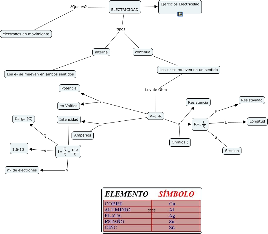 Este mapa conceptual tiene información relacionada a: cmap salva electricidad, <math xmlns="http://www.w3.org/1998/Math/MathML"> <mrow> <mtext> R=ρ </mtext> <mfrac> <mtext> L </mtext> <mtext> S </mtext> </mfrac> </mrow> </math> L Longitud, <math xmlns="http://www.w3.org/1998/Math/MathML"> <mrow> <mtext> Los </mtext> <mmultiscripts> <mtext> e </mtext> <none/> <mtext> - </mtext> </mmultiscripts> <mtext> se mueven en un sentido </mtext> </mrow> </math> Ley de Ohm <math xmlns="http://www.w3.org/1998/Math/MathML"> <mtext> V=I ·R </mtext> </math>, <math xmlns="http://www.w3.org/1998/Math/MathML"> <mrow> <mtext> I= </mtext> <mfrac> <mtext> Q </mtext> <mtext> t </mtext> </mfrac> <mtext> = </mtext> <mfrac> <mtext> n·e </mtext> <mtext> t </mtext> </mfrac> </mrow> </math> e <math xmlns="http://www.w3.org/1998/Math/MathML"> <mrow> <mtext> 1,6·10 </mtext> <mmultiscripts> <mtext> </mtext> <none/> <none/> <mprescripts/> <none/> <mtext> </mtext> </mmultiscripts> </mrow> </math>, <math xmlns="http://www.w3.org/1998/Math/MathML"> <mtext> V=I ·R </mtext> </math> R Ohmios (, ELECTRICIDAD Ejercicios Electricidad, <math xmlns="http://www.w3.org/1998/Math/MathML"> <mrow> <mtext> R=ρ </mtext> <mfrac> <mtext> L </mtext> <mtext> S </mtext> </mfrac> </mrow> </math> ρ Resistividad, ELECTRICIDAD ¿Que es? electrones en movimiento, <math xmlns="http://www.w3.org/1998/Math/MathML"> <mtext> V=I ·R </mtext> </math> I Amperios, alterna Los e- se mueven en ambos sentidos, Intensidad <math xmlns="http://www.w3.org/1998/Math/MathML"> <mrow> <mtext> I= </mtext> <mfrac> <mtext> Q </mtext> <mtext> t </mtext> </mfrac> <mtext> = </mtext> <mfrac> <mtext> n·e </mtext> <mtext> t </mtext> </mfrac> </mrow> </math>, <math xmlns="http://www.w3.org/1998/Math/MathML"> <mtext> V=I ·R </mtext> </math> R <math xmlns="http://www.w3.org/1998/Math/MathML"> <mrow> <mtext> R=ρ </mtext> <mfrac> <mtext> L </mtext> <mtext> S </mtext> </mfrac> </mrow> </math>, <math xmlns="http://www.w3.org/1998/Math/MathML"> <mrow> <mtext> R=ρ </mtext> <mfrac> <mtext> L </mtext> <mtext> S </mtext> </mfrac> </mrow> </math> S Seccion, ELECTRICIDAD tipos alterna, <math xmlns="http://www.w3.org/1998/Math/MathML"> <mtext> V=I ·R </mtext> </math> v en Voltios, <math xmlns="http://www.w3.org/1998/Math/MathML"> <mtext> V=I ·R </mtext> </math> R Resistencia, <math xmlns="http://www.w3.org/1998/Math/MathML"> <mrow> <mtext> I= </mtext> <mfrac> <mtext> Q </mtext> <mtext> t </mtext> </mfrac> <mtext> = </mtext> <mfrac> <mtext> n·e </mtext> <mtext> t </mtext> </mfrac> </mrow> </math> Q Carga (C), <math xmlns="http://www.w3.org/1998/Math/MathML"> <mtext> V=I ·R </mtext> </math> I Intensidad, continua <math xmlns="http://www.w3.org/1998/Math/MathML"> <mrow> <mtext> Los </mtext> <mmultiscripts> <mtext> e </mtext> <none/> <mtext> - </mtext> </mmultiscripts> <mtext> se mueven en un sentido </mtext> </mrow> </math>, <math xmlns="http://www.w3.org/1998/Math/MathML"> <mtext> V=I ·R </mtext> </math> v Potencial, <math xmlns="http://www.w3.org/1998/Math/MathML"> <mrow> <mtext> I= </mtext> <mfrac> <mtext> Q </mtext> <mtext> t </mtext> </mfrac> <mtext> = </mtext> <mfrac> <mtext> n·e </mtext> <mtext> t </mtext> </mfrac> </mrow> </math> n nº de electrones