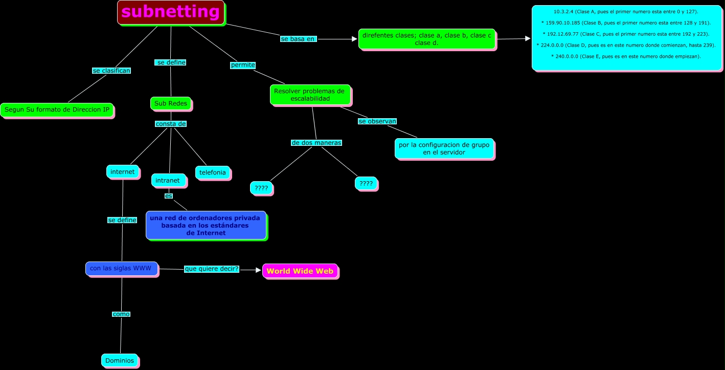 Este mapa conceptual tiene información relacionada a: mapa subnetin, Resolver problemas de escalabilidad de dos maneras ????, Resolver problemas de escalabilidad se observan por la configuracion de grupo en el servidor, Sub Redes consta de telefonia, con las siglas WWW que quiere decir? World Wide Web, subnetting se define Sub Redes, internet se define con las siglas WWW, Sub Redes consta de intranet, subnetting permite Resolver problemas de escalabilidad, Sub Redes consta de internet, direfentes clases; clase a, clase b, clase c clase d. ???? 10.3.2.4 (Clase A, pues el primer numero esta entre 0 y 127). * 159.90.10.185 (Clase B, pues el primer numero esta entre 128 y 191). * 192.12.69.77 (Clase C, pues el primer numero esta entre 192 y 223). * 224.0.0.0 (Clase D, pues es en este numero donde comienzan, hasta 239). * 240.0.0.0 (Clase E, pues es en este numero donde empiezan).