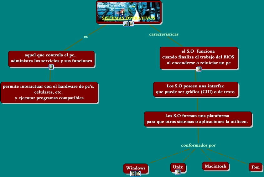 Este Cmap, tiene información relacionada con: SO, SISTEMAS OPERATIVOS es aquel que controla el pc, administra los servicios y sus funciones, Los S.O forman una plataforma para que otros sistemas o aplicaciones la utilicen. conformados por Ibm, Los S.O poseen una interfaz que puede ser gráfica (GUI) o de texto ???? Los S.O forman una plataforma para que otros sistemas o aplicaciones la utilicen., SISTEMAS OPERATIVOS caracteristicas el S.O funciona cuando finaliza el trabajo del BIOS al encenderse o reiniciar un pc, aquel que controla el pc, administra los servicios y sus funciones ???? permite interactuar con el hardware de pc's, celulares, etc. y ejecutar programas compatibles, Los S.O forman una plataforma para que otros sistemas o aplicaciones la utilicen. conformados por Windows, Los S.O forman una plataforma para que otros sistemas o aplicaciones la utilicen. conformados por Macintosh, Los S.O forman una plataforma para que otros sistemas o aplicaciones la utilicen. conformados por Unix, el S.O funciona cuando finaliza el trabajo del BIOS al encenderse o reiniciar un pc Los S.O poseen una interfaz que puede ser gráfica (GUI) o de texto