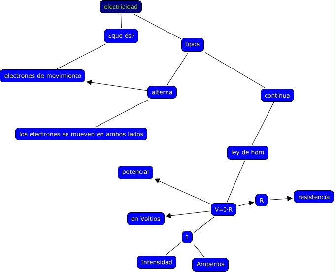 Este mapa conceptual tiene información relacionada a: electricidad alex arco, electricidad ¿que és?, alterna electrones de movimiento, tipos continua, tipos alterna, ley de hom V=I·R, I Amperios, V=I·R en Voltios, V=I·R R, ¿que és? electrones de movimiento, V=I·R potencial, R resistencia, I Intensidad, alterna los electrones se mueven en ambos lados, continua ley de hom, V=I·R I, electricidad tipos