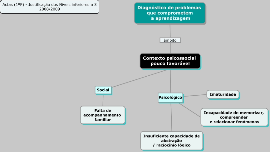 Esse mapa conceitual, produzido no IHMC CmapTools, tem a informação relacionada a: 3º Ciclo - Actas IP - Justificação dos níveis inferiores a 3 -20092010_6, Contexto psicossocial pouco favorável Psicológico Incapacidade de memorizar, compreender e relacionar fenómenos, Contexto psicossocial pouco favorável Social Falta de acompanhamento familiar, Diagnóstico de problemas que comprometem a aprendizagem âmbito Contexto psicossocial pouco favorável, Contexto psicossocial pouco favorável Psicológico Imaturidade, Contexto psicossocial pouco favorável Psicológico Insuficiente capacidade de abstração / raciocínio lógico