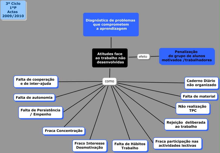 Esse mapa conceitual, produzido no IHMC CmapTools, tem a informação relacionada a: 3º Ciclo - Actas I P - Justificação dos Níveis Inferiroes a 3 - 20092010_3, Atitudes face ao trabalho não desenvolvidas como Falta de autonomia, Atitudes face ao trabalho não desenvolvidas como Caderno Diário não organizado, Atitudes face ao trabalho não desenvolvidas como Falta de cooperação e de inter-ajuda, Atitudes face ao trabalho não desenvolvidas como Fraca Concentração, Diagnóstico de problemas que comprometem a aprendizagem ???? Atitudes face ao trabalho não desenvolvidas, Atitudes face ao trabalho não desenvolvidas como Falta de Persistência / Empenho, Atitudes face ao trabalho não desenvolvidas como Falta de material, Atitudes face ao trabalho não desenvolvidas como Rejeição deliberada ao trabalho, Atitudes face ao trabalho não desenvolvidas como Falta de Hábitos Trabalho, Atitudes face ao trabalho não desenvolvidas como Não realização TPC, Atitudes face ao trabalho não desenvolvidas efeito Penalização do grupo de alunos motivados /trabalhadores, Atitudes face ao trabalho não desenvolvidas como Fraco Interesse Desmotivação, Atitudes face ao trabalho não desenvolvidas como Fraca participação nas actividades lectivas