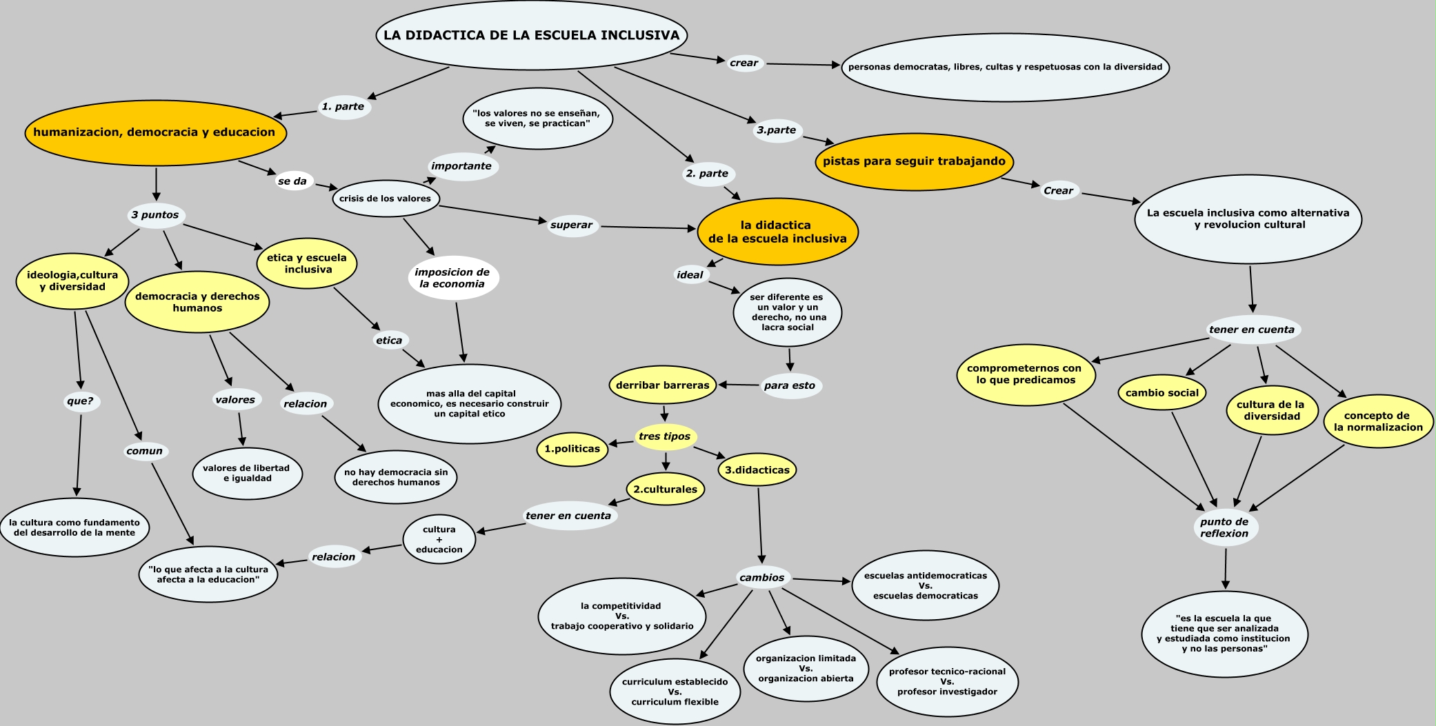 This Concept Map has information related to: lini adimen, 3.didacticas cambios organizacion limitada Vs. organizacion abierta, humanizacion, democracia y educacion 3 puntos etica y escuela inclusiva, ideologia,cultura y diversidad comun "lo que afecta a la cultura afecta a la educacion", crisis de los valores superar la didactica de la escuela inclusiva, ideologia,cultura y diversidad que? la cultura como fundamento del desarrollo de la mente, humanizacion, democracia y educacion se da crisis de los valores, concepto de la normalizacion punto de reflexion "es la escuela la que tiene que ser analizada y estudiada como institucion y no las personas", La escuela inclusiva como alternativa y revolucion cultural tener en cuenta cultura de la diversidad, ser diferente es un valor y un derecho, no una lacra social para esto derribar barreras, crisis de los valores importante "los valores no se enseñan, se viven, se practican"