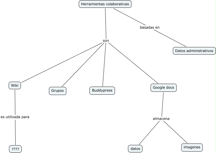 herramientas colaborativas, Herramientas colaborativas son Grupos, Wiki es utilizada para ????, Herramientas colaborativas son Buddypress, Herramientas colaborativas son Google docs, Google docs almacena datos, Herramientas colaborativas son Wiki, Google docs almacena imagenes, Herramientas colaborativas basadas en Datos administrativos