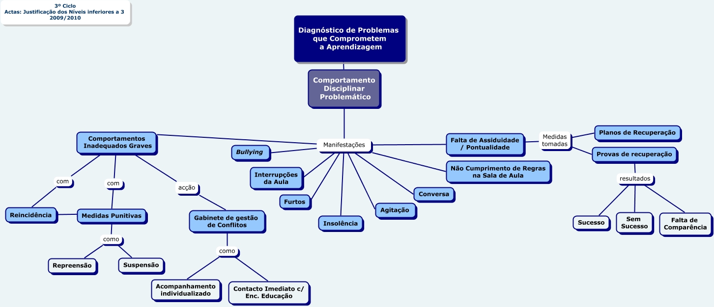 Esse mapa conceitual, produzido no IHMC CmapTools, tem a informação relacionada a: 3º Ciclo - Actas IIP - Justificação dos Níveis Inferiores a 3 - 20092010_4, Comportamento Disciplinar Problemático Manifestações Comportamentos Inadequados Graves, Comportamento Disciplinar Problemático Manifestações Conversa, Provas de recuperação resultados Sucesso, Comportamento Disciplinar Problemático Manifestações Interrupções da Aula, Comportamento Disciplinar Problemático Manifestações Agitação, Gabinete de gestão de Conflitos como Contacto Imediato c/ Enc. Educação, Comportamentos Inadequados Graves com Medidas Punitivas, Comportamento Disciplinar Problemático Manifestações Interrupções da Aula, Comportamentos Inadequados Graves com Reincidência, Comportamento Disciplinar Problemático Manifestações Agitação, Comportamento Disciplinar Problemático Manifestações Agitação, Comportamento Disciplinar Problemático Manifestações Bullying, Medidas Punitivas como Suspensão, Comportamento Disciplinar Problemático Manifestações Interrupções da Aula, Comportamento Disciplinar Problemático Manifestações Comportamentos Inadequados Graves, Comportamento Disciplinar Problemático Manifestações Agitação, Comportamento Disciplinar Problemático Manifestações Bullying, Comportamento Disciplinar Problemático Manifestações Comportamentos Inadequados Graves, Comportamento Disciplinar Problemático Manifestações Insolência, Comportamento Disciplinar Problemático Manifestações Furtos