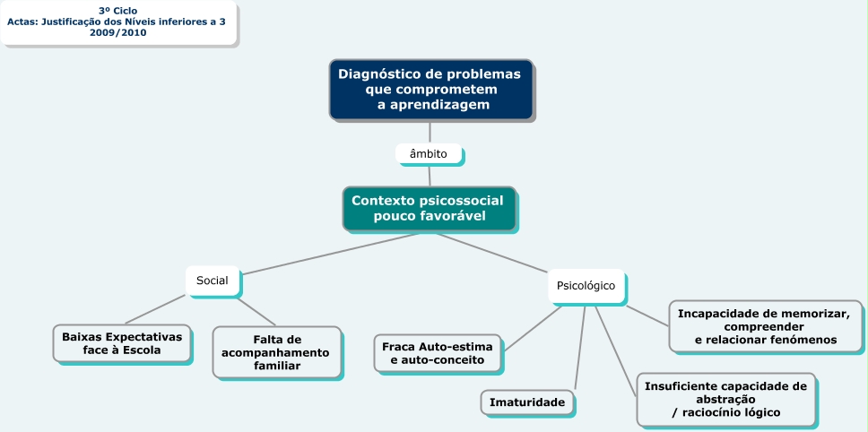 Esse mapa conceitual, produzido no IHMC CmapTools, tem a informação relacionada a: 3º Ciclo - Actas IIP - Justificação dos níveis inferiores a 3 -20092010_6, Contexto psicossocial pouco favorável Psicológico Incapacidade de memorizar, compreender e relacionar fenómenos, Contexto psicossocial pouco favorável Psicológico Fraca Auto-estima e auto-conceito, Contexto psicossocial pouco favorável Psicológico Imaturidade, Contexto psicossocial pouco favorável Social Baixas Expectativas face à Escola, Contexto psicossocial pouco favorável Social Falta de acompanhamento familiar, Diagnóstico de problemas que comprometem a aprendizagem âmbito Contexto psicossocial pouco favorável, Contexto psicossocial pouco favorável Psicológico Insuficiente capacidade de abstração / raciocínio lógico