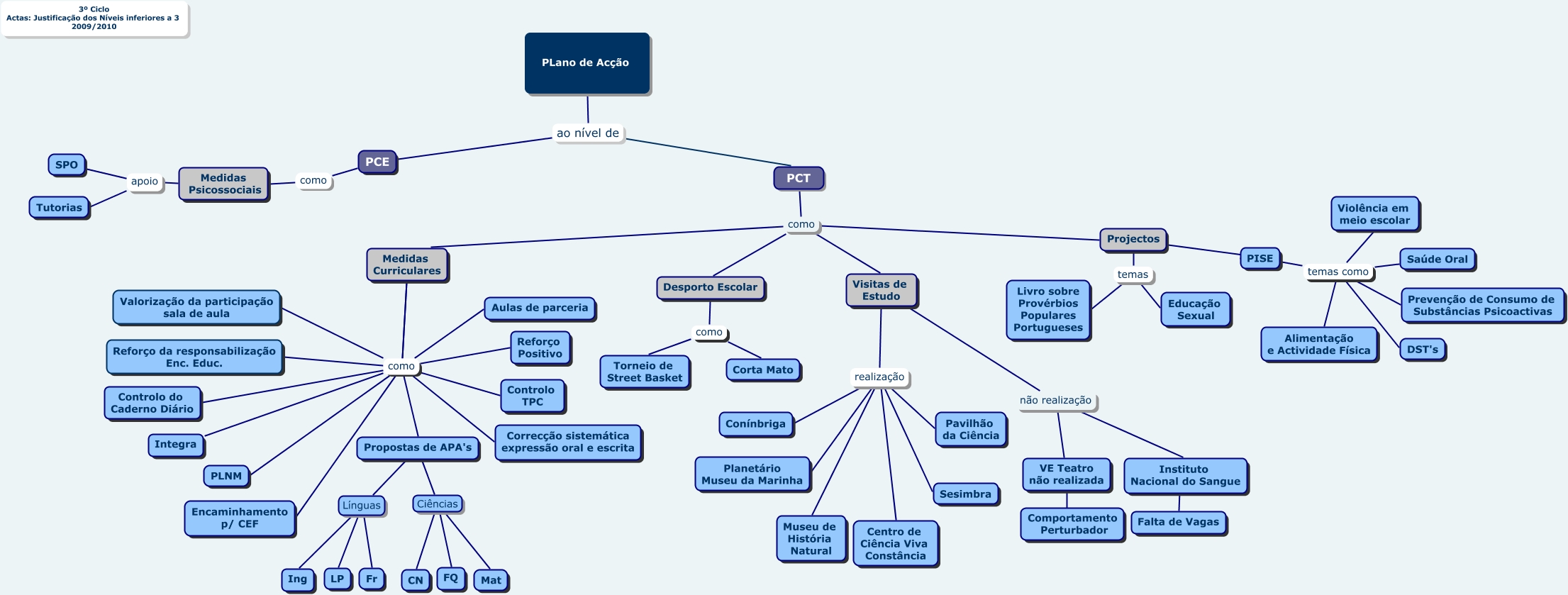 Esse mapa conceitual, produzido no IHMC CmapTools, tem a informação relacionada a: 3º Ciclo - ActasIIP - Medidas PCT - 20092010_5, Projectos temas Livro sobre Provérbios Populares Portugueses, Propostas de APA's Línguas LP, PLano de Acção ao nível de PCE, Projectos temas Educação Sexual, Medidas Curriculares como Encaminhamento p/ CEF, Medidas Curriculares como Propostas de APA's, Medidas Curriculares como Reforço Positivo, Visitas de Estudo realização Sesimbra, Medidas Curriculares como Integra, Medidas Curriculares como PLNM, Visitas de Estudo realização Centro de Ciência Viva Constância, PCT como Desporto Escolar, Medidas Psicossociais apoio Tutorias, PISE temas como Prevenção de Consumo de Substâncias Psicoactivas, PISE temas como Alimentação e Actividade Física, Visitas de Estudo realização Planetário Museu da Marinha, Medidas Curriculares como Correcção sistemática expressão oral e escrita, PISE temas como Violência em meio escolar, PISE temas como Saúde Oral, Desporto Escolar como Corta Mato