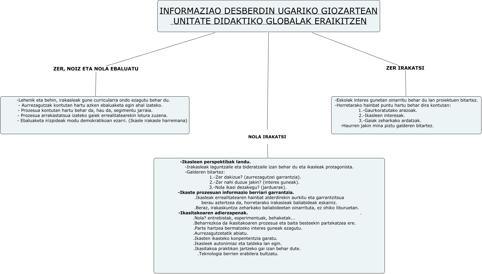 This Concept Map has information related to: NATURAKO ESKEMA, INFORMAZIAO DESBERDIN UGARIKO GIOZARTEAN UNITATE DIDAKTIKO GLOBALAK ERAIKITZEN ZER IRAKATSI -Eskolak interes gunetan oinarritu behar du lan proiektuen bitartez. -Horretarako hainbat puntu hartu behar dira kontutan: 1.-Gaurkoratutako arazoak. 2.-Ikasleen interesak. 3.-Gaiak zeharkako ardatzak. -Haurren jakin mina piztu galderen bitartez., INFORMAZIAO DESBERDIN UGARIKO GIOZARTEAN UNITATE DIDAKTIKO GLOBALAK ERAIKITZEN NOLA IRAKATSI -Ikasleen perspektibak landu. -Irakasleak laguntzaile eta bideratzaile izan behar du eta ikasleak protagonista. -Galderen bitartez: 1.-Zer dakizue? (aurrezagutzei garrantzia). 2.-Zer nahi duzue jakin? (interes guneak). 3.-Nola ikasi dezakegu? (jarduerak). -Ikaste prozesuan informazio berriari garrantzia. .Ikasleak errealitatearen hainbat alderdirekin aurkitu eta garrantzitsua berau aztertzea da, horretarako irakasleak baliabideak eskainiz. .Beraz, irakaskuntza zeharkako baliabideetan oinarrituta, ez ohiko liburuetan. -Ikasitakoaren adierzapenak. . .Nola? entrebistak, esperimentuak, behaketak... .Beharrezkoa da ikasitakoaren prozesua eta baita besteekin partekatzea ere. .Parte hartzea bermatzeko interes guneak ezagutu. .Aurrezagutzetatik abiatu. .Ikasten ikasteko konpententzia garatu. .Ikasleek autonimiaz eta taldeka lan egin. .Ikasitakoa praktikan jartzeko gai izan behar dute. .Teknologia berrien erabilera bultzatu., INFORMAZIAO DESBERDIN UGARIKO GIOZARTEAN UNITATE DIDAKTIKO GLOBALAK ERAIKITZEN ZER, NOIZ ETA NOLA EBALUATU -Lehenik eta behin, irakasleak gune curricularra ondo ezagutu behar du. - Aurrezagutzak kontutan hartu azken ebaluaketa egin ahal izateko. - Prozesua kontutan hartu behar da, hau da, segimentu jarraia. - Prozesua arrakastatsua izateko gaiek errealitatearekin lotura zuzena. - Ebaluaketa irizpideak modu demokratikoan ezarri. (Ikasle irakasle harremana)