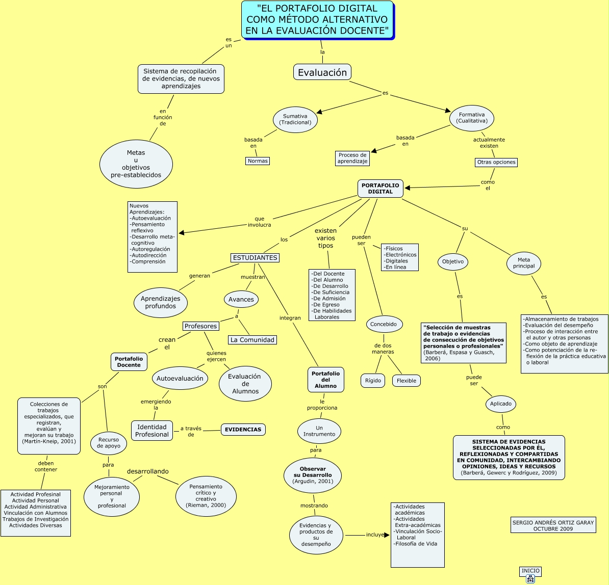 Este Cmap, tiene información relacionada con: EL PORTAFOLIO DIGITAL, Recurso de apoyo para Mejoramiento personal y profesional, Portafolio del Alumno le proporciona Un Instrumento, Otras opciones como el PORTAFOLIO DIGITAL, Evaluación es Formativa (Cualitativa), Objetivo es "Selección de muestras de trabajo o evidencias de consecución de objetivos personales o profesionales" (Barberá, Espasa y Guasch, 2006), Formativa (Cualitativa) basada en Proceso de aprendizaje, ESTUDIANTES muestran Avances, Meta principal es -Almacenamiento de trabajos -Evaluación del desempeño -Proceso de interacción entre el autor y otras personas -Como objeto de aprendizaje -Como potenciación de la re- flexión de la práctica educativa o laboral, Sistema de recopilación de evidencias, de nuevos aprendizajes en función de Metas u objetivos pre-establecidos, PORTAFOLIO DIGITAL su Objetivo, "Selección de muestras de trabajo o evidencias de consecución de objetivos personales o profesionales" (Barberá, Espasa y Guasch, 2006) puede ser Aplicado, Formativa (Cualitativa) actualmente existen Otras opciones, Profesores a La Comunidad, Profesores quienes ejercen Autoevaluación, ESTUDIANTES integran Portafolio del Alumno, Concebido de dos maneras Rígido, Profesores quienes ejercen Evaluación de Alumnos, Portafolio Docente son Recurso de apoyo, PORTAFOLIO DIGITAL pueden ser -Físicos -Electrónicos -Digitales -En línea, Concebido de dos maneras Flexible