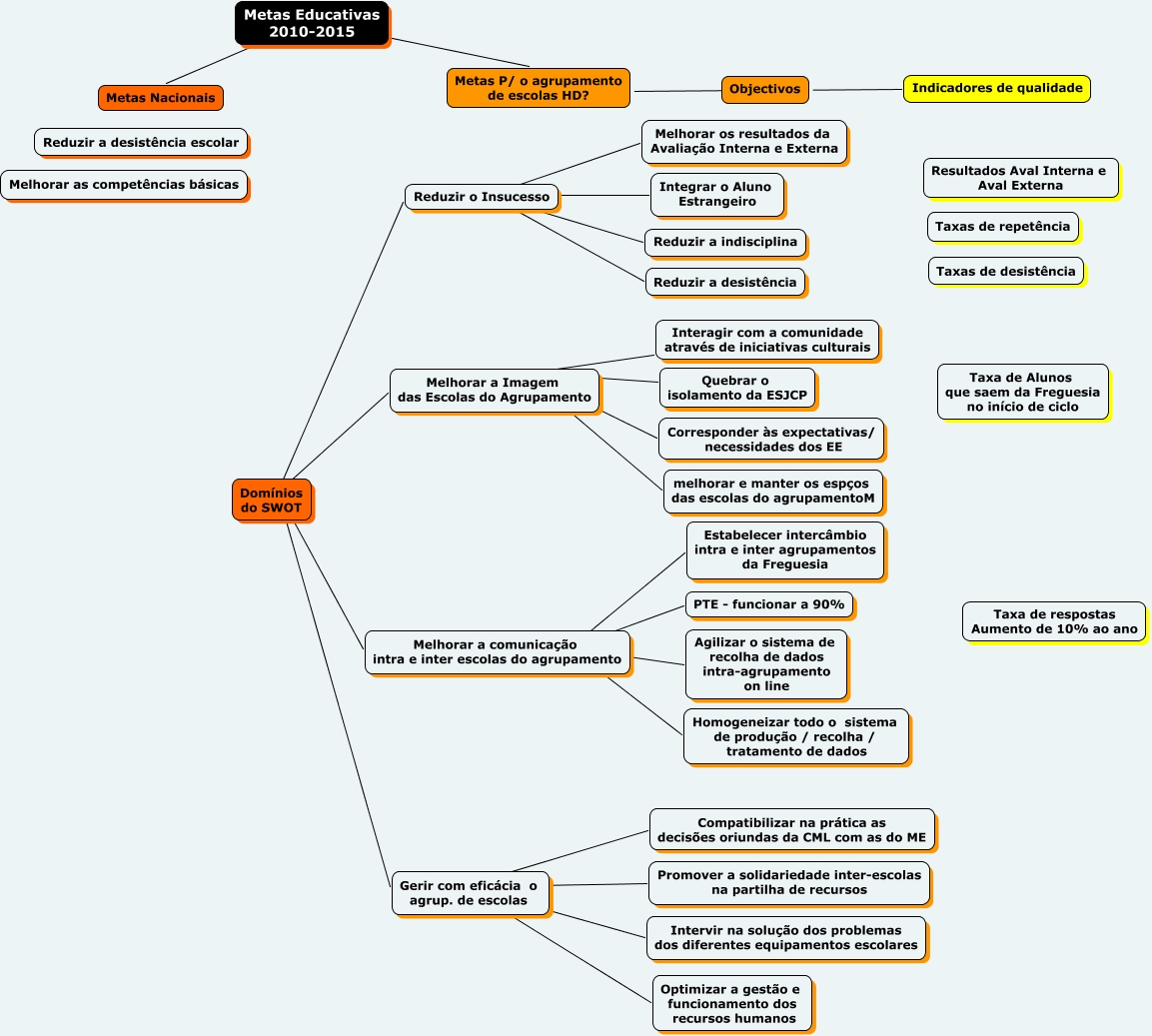 Esse mapa conceitual, produzido no IHMC CmapTools, tem a informação relacionada a: Metas Educativas Agrup. Humberto Delgado - ESJCP, Melhorar a Imagem das Escolas do Agrupamento ???? Interagir com a comunidade através de iniciativas culturais, Melhorar a comunicação intra e inter escolas do agrupamento ???? Agilizar o sistema de recolha de dados intra-agrupamento on line, Reduzir o Insucesso ???? Reduzir a desistência, Metas Educativas 2010-2015 ???? Metas P/ o agrupamento de escolas HD?, Metas Educativas 2010-2015 ???? Metas Nacionais, Domínios do SWOT ???? Gerir com eficácia o agrup. de escolas, Melhorar a comunicação intra e inter escolas do agrupamento ???? Homogeneizar todo o sistema de produção / recolha / tratamento de dados, Melhorar a Imagem das Escolas do Agrupamento ???? melhorar e manter os espços das escolas do agrupamentoM, Gerir com eficácia o agrup. de escolas ???? Promover a solidariedade inter-escolas na partilha de recursos, Domínios do SWOT ???? Reduzir o Insucesso, Gerir com eficácia o agrup. de escolas ???? Optimizar a gestão e funcionamento dos recursos humanos, Gerir com eficácia o agrup. de escolas ???? Intervir na solução dos problemas dos diferentes equipamentos escolares, Gerir com eficácia o agrup. de escolas ???? Compatibilizar na prática as decisões oriundas da CML com as do ME, Reduzir o Insucesso ???? Reduzir a indisciplina, Reduzir o Insucesso ???? Integrar o Aluno Estrangeiro, Melhorar a comunicação intra e inter escolas do agrupamento ???? Estabelecer intercâmbio intra e inter agrupamentos da Freguesia, Domínios do SWOT ???? Melhorar a comunicação intra e inter escolas do agrupamento, Domínios do SWOT ???? Melhorar a Imagem das Escolas do Agrupamento, Melhorar a comunicação intra e inter escolas do agrupamento ???? PTE - funcionar a 90%, Melhorar a Imagem das Escolas do Agrupamento ???? Corresponder às expectativas/ necessidades dos EE