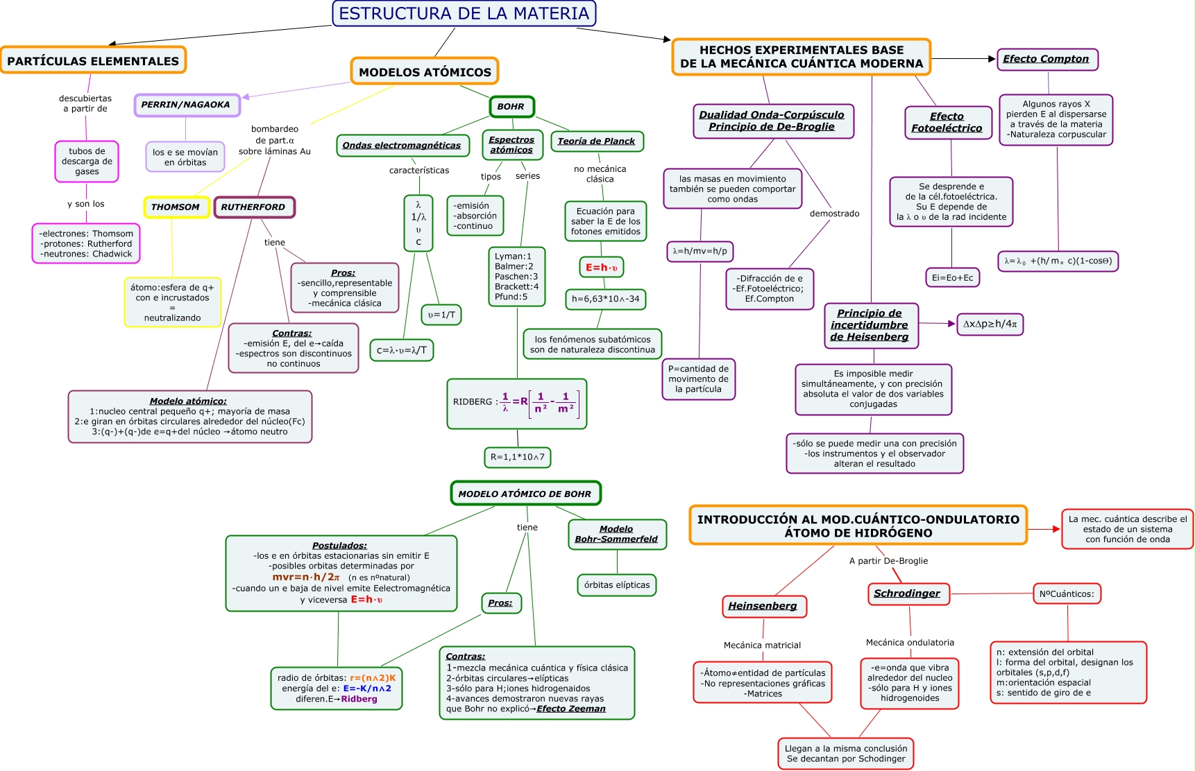 Este mapa conceptual tiene información relacionada a: Estructura de la Materia, Núria Mallofré, INTRODUCCIÓN AL MOD.CUÁNTICO-ONDULATORIO ÁTOMO DE HIDRÓGENO ???? Heinsenberg, RUTHERFORD tiene Contras: -emisión E, del e→caída -espectros son discontinuos no continuos, Dualidad Onda-Corpúsculo Principio de De-Broglie demostrado -Difracción de e -Ef.Fotoeléctrico; Ef.Compton, h=6,63*10∧-34 ???? los fenómenos subatómicos son de naturaleza discontinua, E=h⋅υ ???? h=6,63*10∧-34, BOHR ???? Ondas electromagnéticas, NºCuánticos: ???? n: extensión del orbital l: forma del orbital, designan los orbitales (s,p,d,f) m:orientación espacial s: sentido de giro de e, Efecto Compton ???? Algunos rayos X pierden E al dispersarse a través de la materia -Naturaleza corpuscular, MODELO ATÓMICO DE BOHR tiene Pros:, MODELOS ATÓMICOS BOHR, MODELO ATÓMICO DE BOHR ???? Modelo Bohr-Sommerfeld, Ondas electromagnéticas características λ 1/λ υ c, las masas en movimiento también se pueden comportar como ondas ???? λ=h/mv=h/p, ESTRUCTURA DE LA MATERIA MODELOS ATÓMICOS, MODELOS ATÓMICOS PERRIN/NAGAOKA, PERRIN/NAGAOKA ???? los e se movían en órbitas, Postulados: -los e en órbitas estacionarias sin emitir E -posibles orbitas determinadas por mvr=n⋅h/2π (n es nºnatural) -cuando un e baja de nivel emite Eelectromagnética y viceversa E=h⋅υ cálculo de: radio de órbitas: r=(n∧2)K energía del e: E=-K/n∧2 diferen.E→Ridberg, HECHOS EXPERIMENTALES BASE DE LA MECÁNICA CUÁNTICA MODERNA ???? Principio de incertidumbre de Heisenberg, Efecto Fotoeléctrico ???? Se desprende e de la cél.fotoeléctrica. Su E depende de la λ o υ de la rad incidente, Ecuación para saber la E de los fotones emitidos ???? E=h⋅υ