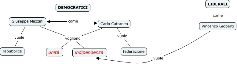Questa Mappa Concettuale ha informazioni correlate a: Risorgimento, DEMOCRATICI come Carlo Cattaneo, Giuseppe Mazzini vogliono indipendenza, Giuseppe Mazzini vuole repubblica, LIBERALI come Vincenzo Gioberti, DEMOCRATICI come Giuseppe Mazzini, Vincenzo Gioberti vuole indipendenza, Carlo Cattaneo vogliono unità, Carlo Cattaneo vuole federazione, Carlo Cattaneo vogliono indipendenza, Giuseppe Mazzini vogliono unità