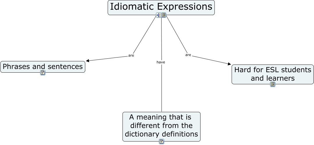 Este mapa conceptual tiene información relacionada a: Idiomatic Expressions, Idiomatic Expressions have A meaning that is different from the dictionary definitions, Idiomatic Expressions are Phrases and sentences, Idiomatic Expressions are Hard for ESL students and learners