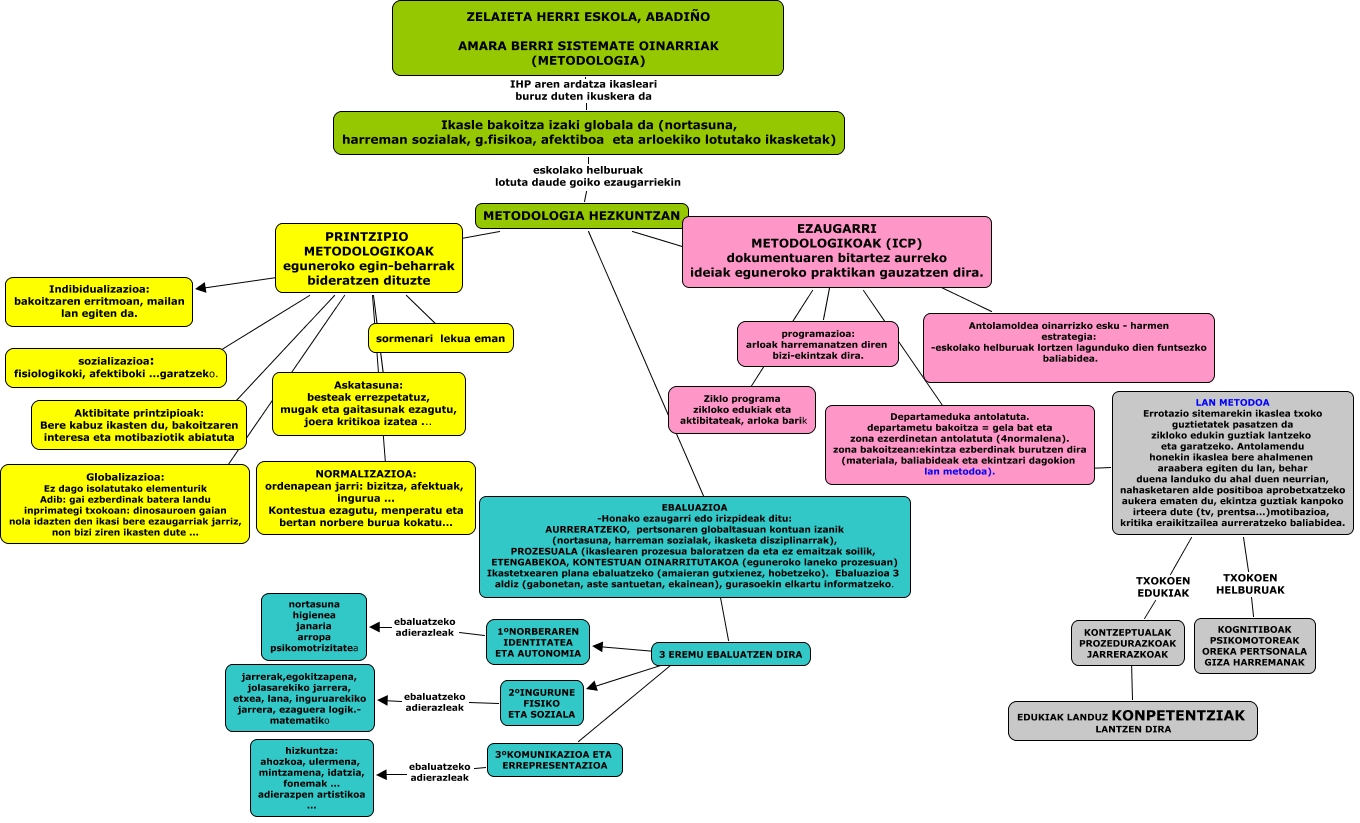 Este Cmap, tiene información relacionada con: Zelaieta Herri Eskola ( Amara Berri metodologia ), METODOLOGIA HEZKUNTZAN ???? EBALUAZIOA -Honako ezaugarri edo irizpideak ditu: AURRERATZEKO, pertsonaren globaltasuan kontuan izanik (nortasuna, harreman sozialak, ikasketa disziplinarrak), PROZESUALA (ikaslearen prozesua baloratzen da eta ez emaitzak soilik, ETENGABEKOA, KONTESTUAN OINARRITUTAKOA (eguneroko laneko prozesuan) Ikastetxearen plana ebaluatzeko (amaieran gutxienez, hobetzeko). Ebaluazioa 3 aldiz (gabonetan, aste santuetan, ekainean), gurasoekin elkartu informatzeko., EZAUGARRI METODOLOGIKOAK (ICP) dokumentuaren bitartez aurreko ideiak eguneroko praktikan gauzatzen dira. ???? Antolamoldea oinarrizko esku - harmen estrategia: -eskolako helburuak lortzen lagunduko dien funtsezko baliabidea., LAN METODOA Errotazio sitemarekin ikaslea txoko guztietatek pasatzen da zikloko edukin guztiak lantzeko eta garatzeko. Antolamendu honekin ikaslea bere ahalmenen araabera egiten du lan, behar duena landuko du ahal duen neurrian, nahasketaren alde positiboa aprobetxatzeko aukera ematen du, ekintza guztiak kanpoko irteera dute (tv, prentsa...)motibazioa, kritika eraikitzailea aurreratzeko baliabidea. ???? Departameduka antolatuta. departametu bakoitza = gela bat eta zona ezerdinetan antolatuta (4normalena). zona bakoitzean:ekintza ezberdinak burutzen dira (materiala, baliabideak eta ekintzari dagokion lan metodoa)., 3 EREMU EBALUATZEN DIRA ???? 2ºINGURUNE FISIKO ETA SOZIALA, EZAUGARRI METODOLOGIKOAK (ICP) dokumentuaren bitartez aurreko ideiak eguneroko praktikan gauzatzen dira. ???? Ziklo programa zikloko edukiak eta aktibitateak, arloka barik, PRINTZIPIO METODOLOGIKOAK eguneroko egin-beharrak bideratzen dituzte ???? Indibidualizazioa: bakoitzaren erritmoan, mailan lan egiten da., EZAUGARRI METODOLOGIKOAK (ICP) dokumentuaren bitartez aurreko ideiak eguneroko praktikan gauzatzen dira. ???? programazioa: arloak harremanatzen diren bizi-ekintzak dira., 2ºINGURUNE FISIKO ETA SOZIALA ebaluatzeko adierazleak jarrerak,egokitzapena, jolasarekiko jarrera, etxea, lana, inguruarekiko jarrera, ezaguera logik.- matematiko, METODOLOGIA HEZKUNTZAN ???? EZAUGARRI METODOLOGIKOAK (ICP) dokumentuaren bitartez aurreko ideiak eguneroko praktikan gauzatzen dira., ZELAIETA HERRI ESKOLA, ABADIÑO AMARA BERRI SISTEMATE OINARRIAK (METODOLOGIA) IHP aren ardatza ikasleari buruz duten ikuskera da Ikasle bakoitza izaki globala da (nortasuna, harreman sozialak, g.fisikoa, afektiboa eta arloekiko lotutako ikasketak), PRINTZIPIO METODOLOGIKOAK eguneroko egin-beharrak bideratzen dituzte ???? NORMALIZAZIOA: ordenapean jarri: bizitza, afektuak, ingurua ... Kontestua ezagutu, menperatu eta bertan norbere burua kokatu..., PRINTZIPIO METODOLOGIKOAK eguneroko egin-beharrak bideratzen dituzte ???? Aktibitate printzipioak: Bere kabuz ikasten du, bakoitzaren interesa eta motibaziotik abiatuta, EBALUAZIOA -Honako ezaugarri edo irizpideak ditu: AURRERATZEKO, pertsonaren globaltasuan kontuan izanik (nortasuna, harreman sozialak, ikasketa disziplinarrak), PROZESUALA (ikaslearen prozesua baloratzen da eta ez emaitzak soilik, ETENGABEKOA, KONTESTUAN OINARRITUTAKOA (eguneroko laneko prozesuan) Ikastetxearen plana ebaluatzeko (amaieran gutxienez, hobetzeko). Ebaluazioa 3 aldiz (gabonetan, aste santuetan, ekainean), gurasoekin elkartu informatzeko. ???? 3 EREMU EBALUATZEN DIRA, PRINTZIPIO METODOLOGIKOAK eguneroko egin-beharrak bideratzen dituzte ???? sormenari lekua eman, PRINTZIPIO METODOLOGIKOAK eguneroko egin-beharrak bideratzen dituzte ???? sozializazioa: fisiologikoki, afektiboki ...garatzeko., PRINTZIPIO METODOLOGIKOAK eguneroko egin-beharrak bideratzen dituzte ???? Globalizazioa: Ez dago isolatutako elementurik Adib: gai ezberdinak batera landu inprimategi txokoan: dinosauroen gaian nola idazten den ikasi bere ezaugarriak jarriz, non bizi ziren ikasten dute ..., 1ºNORBERAREN IDENTITATEA ETA AUTONOMIA ebaluatzeko adierazleak nortasuna higienea janaria arropa psikomotrizitatea, KONTZEPTUALAK PROZEDURAZKOAK JARRERAZKOAK ???? EDUKIAK LANDUZ KONPETENTZIAK LANTZEN DIRA, Ikasle bakoitza izaki globala da (nortasuna, harreman sozialak, g.fisikoa, afektiboa eta arloekiko lotutako ikasketak) eskolako helburuak lotuta daude goiko ezaugarriekin METODOLOGIA HEZKUNTZAN, 3 EREMU EBALUATZEN DIRA ???? 3ºKOMUNIKAZIOA ETA ERREPRESENTAZIOA