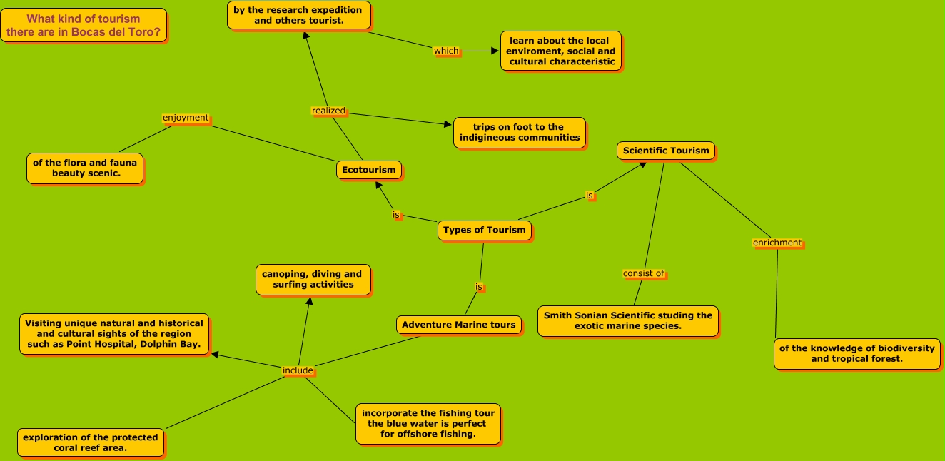 Este Cmap, tiene información relacionada con: types of tourism in Bocas del Toro, Adventure Marine tours include Visiting unique natural and historical and cultural sights of the region such as Point Hospital, Dolphin Bay., Ecotourism realized trips on foot to the indigineous communities, Types of Tourism is Adventure Marine tours, Types of Tourism is Ecotourism, Adventure Marine tours include exploration of the protected coral reef area., Scientific Tourism enrichment of the knowledge of biodiversity and tropical forest., Types of Tourism is Scientific Tourism, Adventure Marine tours include canoping, diving and surfing activities, by the research expedition and others tourist. which learn about the local enviroment, social and cultural characteristic, Scientific Tourism consist of Smith Sonian Scientific studing the exotic marine species., Adventure Marine tours include incorporate the fishing tour the blue water is perfect for offshore fishing., Ecotourism enjoyment of the flora and fauna beauty scenic., Ecotourism realized by the research expedition and others tourist.