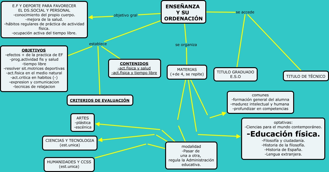 Este Cmap, tiene información relacionada con: rd1467, ENSEÑANZA Y SU ORDENACIÓN se accede TITULO GRADUADO E.S.O, MATERIAS (+de 4, se repite) optativas: -Ciencias para el mundo contemporáneo. -Educación física. -Filosofía y ciudadanía. -Historia de la filosofía. -Historia de España. -Lengua extranjera., modalidad -Pasar de una a otra, regula la Administración educativa. ARTES -plástica -escénica, ENSEÑANZA Y SU ORDENACIÓN se accede TITULO DE TÉCNICO, modalidad -Pasar de una a otra, regula la Administración educativa. CIENCIAS Y TECNOLOGIA (est.unica), ENSEÑANZA Y SU ORDENACIÓN establece OBJETIVOS -efectos + de la practica de EF -prog.actividad fis y salud -tiempo libre -resolver sit.motrices deportivas -act.fisica en el medio natural -act.critica en habitos (-) -expresion y comunicacion -tecnicas de relajacion, ENSEÑANZA Y SU ORDENACIÓN establece CRITERIOS DE EVALUACIÓN, MATERIAS (+de 4, se repite) modalidad -Pasar de una a otra, regula la Administración educativa., MATERIAS (+de 4, se repite) comunes -formación general del alumna -madurez intelectual y humana -profundizar en competencias, ENSEÑANZA Y SU ORDENACIÓN establece CONTENIDOS -act.fisica y salud -act.fisica y tiempo libre, ENSEÑANZA Y SU ORDENACIÓN se organiza MATERIAS (+de 4, se repite), modalidad -Pasar de una a otra, regula la Administración educativa. HUMANIDADES Y CCSS (est.unica), ENSEÑANZA Y SU ORDENACIÓN objetivo gral E.F Y DEPORTE PARA FAVORECER EL DS.SOCIAL Y PERSONAL -conocimiento del propio cuerpo. -mejora de la salud. -hábitos regulares de práctica de actividad física. -ocupación activa del tiempo libre.
