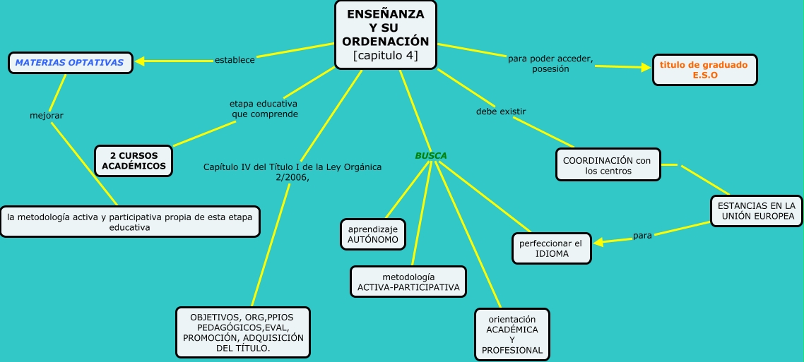 Este Cmap, tiene información relacionada con: LEA, MATERIAS OPTATIVAS mejorar la metodología activa y participativa propia de esta etapa educativa, ENSEÑANZA Y SU ORDENACIÓN [capitulo 4] Capítulo IV del Título I de la Ley Orgánica 2/2006, OBJETIVOS, ORG,PPIOS PEDAGÓGICOS,EVAL, PROMOCIÓN, ADQUISICIÓN DEL TÍTULO., ENSEÑANZA Y SU ORDENACIÓN [capitulo 4] BUSCA perfeccionar el IDIOMA, ENSEÑANZA Y SU ORDENACIÓN [capitulo 4] debe existir COORDINACIÓN con los centros, ENSEÑANZA Y SU ORDENACIÓN [capitulo 4] establece MATERIAS OPTATIVAS, ENSEÑANZA Y SU ORDENACIÓN [capitulo 4] BUSCA metodología ACTIVA-PARTICIPATIVA, ENSEÑANZA Y SU ORDENACIÓN [capitulo 4] BUSCA orientación ACADÉMICA Y PROFESIONAL, COORDINACIÓN con los centros ESTANCIAS EN LA UNIÓN EUROPEA, ENSEÑANZA Y SU ORDENACIÓN [capitulo 4] etapa educativa que comprende 2 CURSOS ACADÉMICOS, ENSEÑANZA Y SU ORDENACIÓN [capitulo 4] BUSCA aprendizaje AUTÓNOMO, ENSEÑANZA Y SU ORDENACIÓN [capitulo 4] para poder acceder, posesión titulo de graduado E.S.O, ESTANCIAS EN LA UNIÓN EUROPEA para perfeccionar el IDIOMA