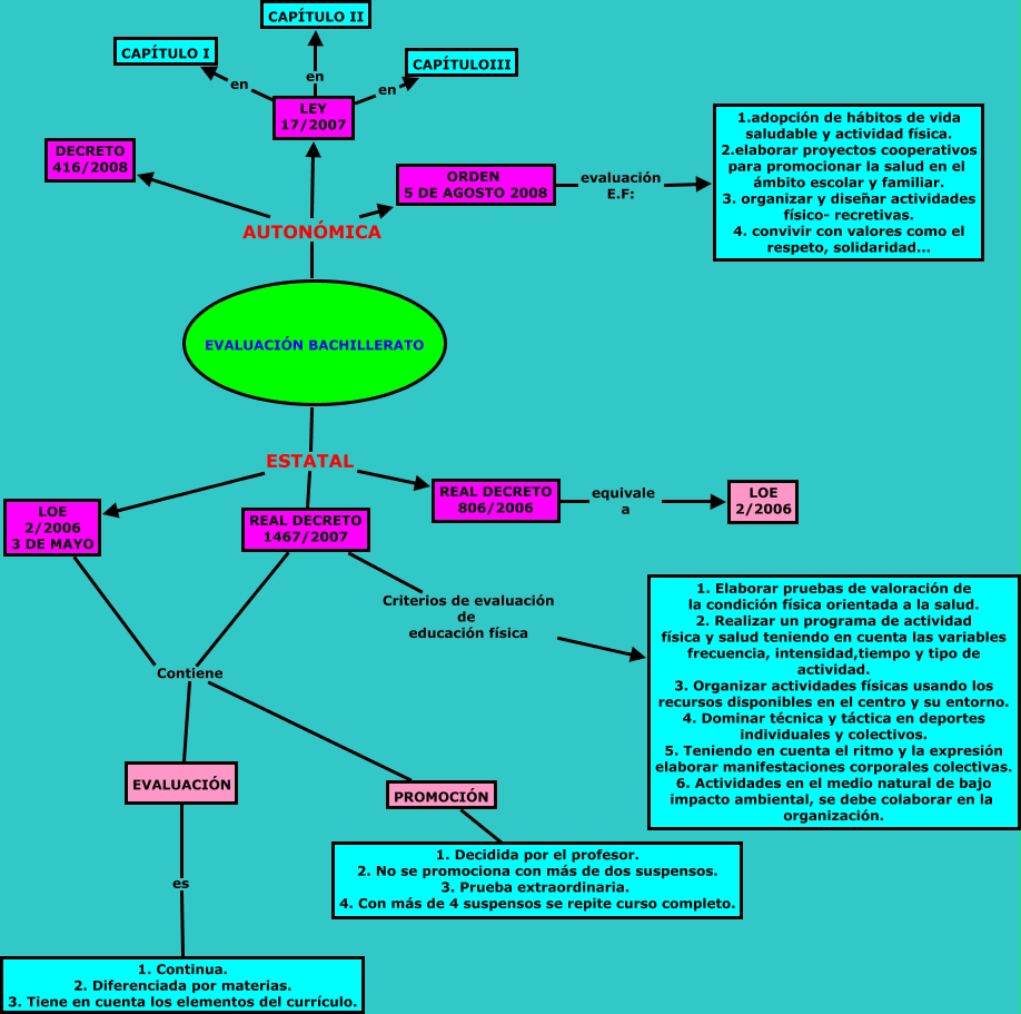 Este Cmap, tiene información relacionada con: evaluación, EVALUACIÓN BACHILLERATO ESTATAL LOE 2/2006 3 DE MAYO, LEY 17/2007 en CAPÍTULO II, LOE 2/2006 3 DE MAYO Contiene PROMOCIÓN, EVALUACIÓN BACHILLERATO AUTONÓMICA LEY 17/2007, REAL DECRETO 1467/2007 Criterios de evaluación de educación física 1. Elaborar pruebas de valoración de la condición física orientada a la salud. 2. Realizar un programa de actividad física y salud teniendo en cuenta las variables frecuencia, intensidad,tiempo y tipo de actividad. 3. Organizar actividades físicas usando los recursos disponibles en el centro y su entorno. 4. Dominar técnica y táctica en deportes individuales y colectivos. 5. Teniendo en cuenta el ritmo y la expresión elaborar manifestaciones corporales colectivas. 6. Actividades en el medio natural de bajo impacto ambiental, se debe colaborar en la organización., REAL DECRETO 1467/2007 Contiene PROMOCIÓN, PROMOCIÓN ???? 1. Decidida por el profesor. 2. No se promociona con más de dos suspensos. 3. Prueba extraordinaria. 4. Con más de 4 suspensos se repite curso completo., REAL DECRETO 806/2006 equivale a LOE 2/2006, EVALUACIÓN es 1. Continua. 2. Diferenciada por materias. 3. Tiene en cuenta los elementos del currículo., LEY 17/2007 en CAPÍTULO I, EVALUACIÓN BACHILLERATO AUTONÓMICA ORDEN 5 DE AGOSTO 2008, ORDEN 5 DE AGOSTO 2008 evaluación E.F: 1.adopción de hábitos de vida saludable y actividad física. 2.elaborar proyectos cooperativos para promocionar la salud en el ámbito escolar y familiar. 3. organizar y diseñar actividades físico- recretivas. 4. convivir con valores como el respeto, solidaridad..., EVALUACIÓN BACHILLERATO ESTATAL REAL DECRETO 1467/2007, LEY 17/2007 en CAPÍTULOIII, REAL DECRETO 1467/2007 Contiene EVALUACIÓN, EVALUACIÓN BACHILLERATO AUTONÓMICA DECRETO 416/2008, EVALUACIÓN BACHILLERATO ESTATAL REAL DECRETO 806/2006, LOE 2/2006 3 DE MAYO Contiene EVALUACIÓN