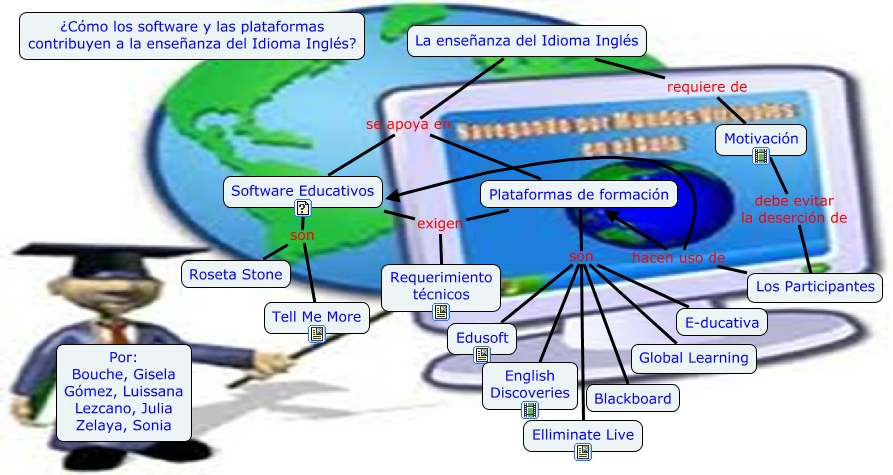 Este mapa conceptual tiene información relacionada a: Software y Plataformas Educativas, Los Participantes hacen uso de Software Educativos, Plataformas de formación exigen Requerimiento técnicos, Plataformas de formación son Global Learning, Software Educativos son Tell Me More, Plataformas de formación son Edusoft, La enseñanza del Idioma Inglés se apoya en Software Educativos, La enseñanza del Idioma Inglés se apoya en Plataformas de formación, Plataformas de formación son English Discoveries, La enseñanza del Idioma Inglés requiere de Motivación, Motivación debe evitar la deserción de Los Participantes, Software Educativos exigen Requerimiento técnicos, Software Educativos son Roseta Stone, Los Participantes hacen uso de Plataformas de formación, Plataformas de formación son E-ducativa, Plataformas de formación son Elliminate Live, Plataformas de formación son Blackboard