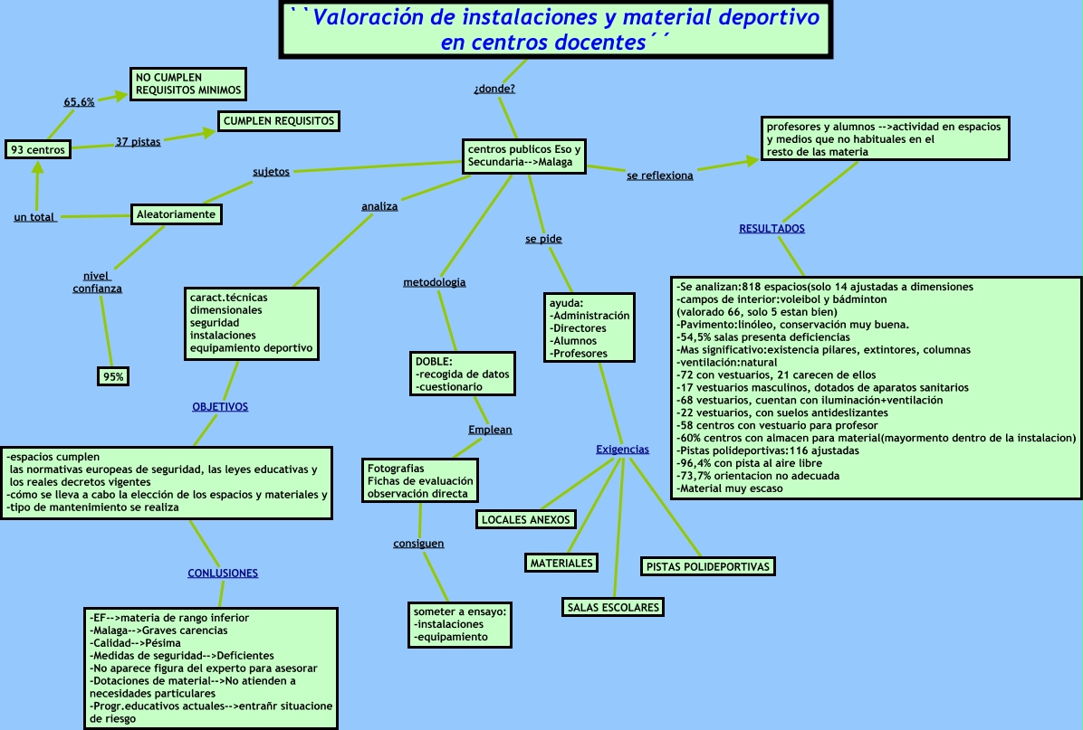 Este Cmap, tiene información relacionada con: esquema instalaciones y material deportivo en centros docentes, centros publicos Eso y Secundaria-->Malaga sujetos Aleatoriamente, centros publicos Eso y Secundaria-->Malaga se pide ayuda: -Administración -Directores -Alumnos -Profesores, ayuda: -Administración -Directores -Alumnos -Profesores Exigencias MATERIALES, centros publicos Eso y Secundaria-->Malaga se reflexiona profesores y alumnos -->actividad en espacios y medios que no habituales en el resto de las materia, 93 centros 65,6% NO CUMPLEN REQUISITOS MINIMOS, Fotografias Fichas de evaluación observación directa consiguen someter a ensayo: -instalaciones -equipamiento, caract.técnicas dimensionales seguridad instalaciones equipamiento deportivo OBJETIVOS -espacios cumplen las normativas europeas de seguridad, las leyes educativas y los reales decretos vigentes -cómo se lleva a cabo la elección de los espacios y materiales y -tipo de mantenimiento se realiza, -espacios cumplen las normativas europeas de seguridad, las leyes educativas y los reales decretos vigentes -cómo se lleva a cabo la elección de los espacios y materiales y -tipo de mantenimiento se realiza CONLUSIONES -EF-->materia de rango inferior -Malaga-->Graves carencias -Calidad-->Pésima -Medidas de seguridad-->Deficientes -No aparece figura del experto para asesorar -Dotaciones de material-->No atienden a necesidades particulares -Progr.educativos actuales-->entrañr situacione de riesgo, profesores y alumnos -->actividad en espacios y medios que no habituales en el resto de las materia RESULTADOS -Se analizan:818 espacios(solo 14 ajustadas a dimensiones -campos de interior:voleibol y bádminton (valorado 66, solo 5 estan bien) -Pavimento:linóleo, conservación muy buena. -54,5% salas presenta deficiencias -Mas significativo:existencia pilares, extintores, columnas -ventilación:natural -72 con vestuarios, 21 carecen de ellos -17 vestuarios masculinos, dotados de aparatos sanitarios -68 vestuarios, cuentan con iluminación+ventilación -22 vestuarios, con suelos antideslizantes -58 centros con vestuario para profesor -60% centros con almacen para material(mayormento dentro de la instalacion) -Pistas polideportivas:116 ajustadas -96,4% con pista al aire libre -73,7% orientacion no adecuada -Material muy escaso, ayuda: -Administración -Directores -Alumnos -Profesores Exigencias PISTAS POLIDEPORTIVAS, ``Valoración de instalaciones y material deportivo en centros docentes´´ ¿donde? centros publicos Eso y Secundaria-->Malaga, ayuda: -Administración -Directores -Alumnos -Profesores Exigencias SALAS ESCOLARES, ayuda: -Administración -Directores -Alumnos -Profesores Exigencias LOCALES ANEXOS, centros publicos Eso y Secundaria-->Malaga analiza caract.técnicas dimensionales seguridad instalaciones equipamiento deportivo, centros publicos Eso y Secundaria-->Malaga metodologia DOBLE: -recogida de datos -cuestionario, DOBLE: -recogida de datos -cuestionario Emplean Fotografias Fichas de evaluación observación directa, Aleatoriamente nivel confianza 95%, 93 centros 37 pistas CUMPLEN REQUISITOS, Aleatoriamente un total 93 centros