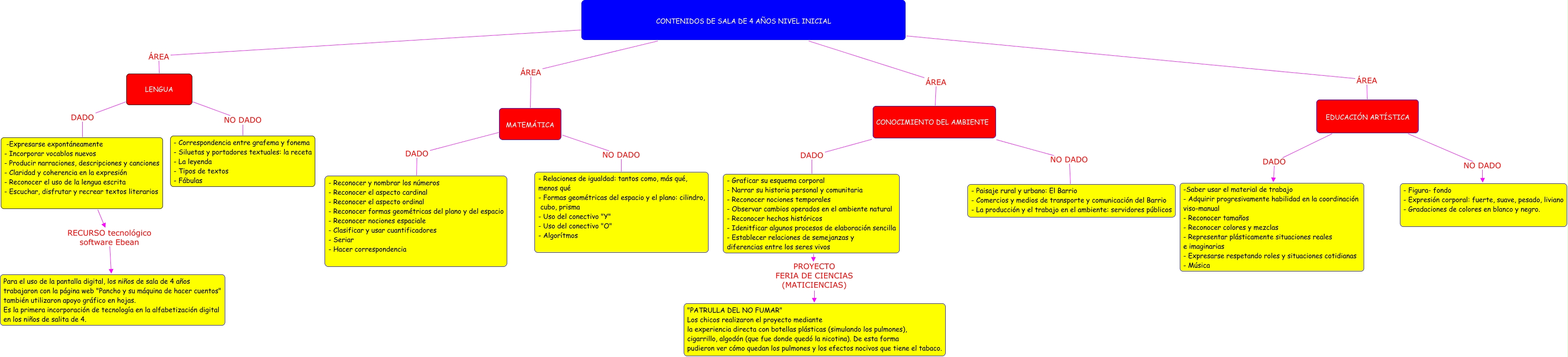 Este Cmap, tiene información relacionada con: contenidos conceptuales nivel inicial, MATEMÁTICA DADO - Reconocer y nombrar los números - Reconocer el aspecto cardinal - Reconocer el aspecto ordinal - Reconocer formas geométricas del plano y del espacio - Reconocer nociones espaciale - Clasificar y usar cuantificadores - Seriar - Hacer correspondencia, LENGUA DADO -Expresarse expontáneamente - Incorporar vocablos nuevos - Producir narraciones, descripciones y canciones - Claridad y coherencia en la expresión - Reconocer el uso de la lengua escrita - Escuchar, disfrutar y recrear textos literarios, CONOCIMIENTO DEL AMBIENTE NO DADO - Paisaje rural y urbano: El Barrio - Comercios y medios de transporte y comunicación del Barrio - La producción y el trabajo en el ambiente: servidores públicos, LENGUA NO DADO - Correspondencia entre grafema y fonema - Siluetas y portadores textuales: la receta - La leyenda - Tipos de textos - Fábulas, - Graficar su esquema corporal - Narrar su historia personal y comunitaria - Reconocer nociones temporales - Observar cambios operados en el ambiente natural - Reconocer hechos históricos - Idenitficar algunos procesos de elaboración sencilla - Establecer relaciones de semejanzas y diferencias entre los seres vivos PROYECTO FERIA DE CIENCIAS (MATICIENCIAS) "PATRULLA DEL NO FUMAR" Los chicos realizaron el proyecto mediante la experiencia directa con botellas plásticas (simulando los pulmones), cigarrillo, algodón (que fue donde quedó la nicotina). De esta forma pudieron ver cómo quedan los pulmones y los efectos nocivos que tiene el tabaco., MATEMÁTICA NO DADO - Relaciones de igualdad: tantos como, más qué, menos qué - Formas geométricas del espacio y el plano: cilindro, cubo, prisma - Uso del conectivo "Y" - Uso del conectivo "O" - Algorítmos, -Expresarse expontáneamente - Incorporar vocablos nuevos - Producir narraciones, descripciones y canciones - Claridad y coherencia en la expresión - Reconocer el uso de la lengua escrita - Escuchar, disfrutar y recrear textos literarios RECURSO tecnológico software Ebean Para el uso de la pantalla digital, los niños de sala de 4 años trabajaron con la página web "Pancho y su máquina de hacer cuentos" también utilizaron apoyo gráfico en hojas. Es la primera incorporación de tecnología en la alfabetización digital en los niños de salita de 4., CONOCIMIENTO DEL AMBIENTE DADO - Graficar su esquema corporal - Narrar su historia personal y comunitaria - Reconocer nociones temporales - Observar cambios operados en el ambiente natural - Reconocer hechos históricos - Idenitficar algunos procesos de elaboración sencilla - Establecer relaciones de semejanzas y diferencias entre los seres vivos, EDUCACIÓN ARTÍSTICA NO DADO - Figura- fondo - Expresión corporal: fuerte, suave, pesado, liviano - Gradaciones de colores en blanco y negro., CONTENIDOS DE SALA DE 4 AÑOS NIVEL INICIAL ÁREA LENGUA, EDUCACIÓN ARTÍSTICA DADO -Saber usar el material de trabajo - Adquirir progresivamente habilidad en la coordinación viso-manual - Reconocer tamaños - Reconocer colores y mezclas - Representar plásticamente situaciones reales e imaginarias - Expresarse respetando roles y situaciones cotidianas - Música, CONTENIDOS DE SALA DE 4 AÑOS NIVEL INICIAL ÁREA EDUCACIÓN ARTÍSTICA, CONTENIDOS DE SALA DE 4 AÑOS NIVEL INICIAL ÁREA MATEMÁTICA, CONTENIDOS DE SALA DE 4 AÑOS NIVEL INICIAL ÁREA CONOCIMIENTO DEL AMBIENTE