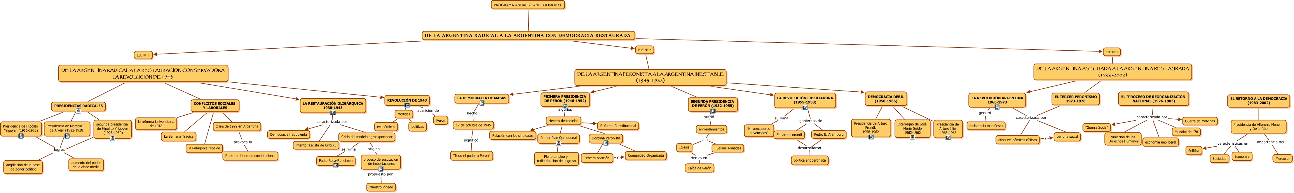 Este Cmap, tiene información relacionada con: PROGRAMA 2°, DE LA ARGENTINA RADICAL A LA RESTAURACIÓN CONSERVADORA. LA REVOLUCIÓN DE 1943. REVOLUCIÓN DE 1943, DEMOCRACIA DÉBIL (1958-1966) Interregno de José María Guido 1962-1962, Iglesia derivó en Caída de Perón, Doctrina Peronista Comunidad Organizada, LA RESTAURACIÓN OLIGÁRQUICA 1930-1943 caracterizada por Crisis del modelo agroexportador, DE LA ARGENTINA RADICAL A LA RESTAURACIÓN CONSERVADORA. LA REVOLUCIÓN DE 1943. CONFLCITOS SOCIALES Y LABORALES, PRESIDENCIAS RADICALES Presidencia de Hipólito Yrigoyen (1916-1922), enfrentamientos con Iglesia, DE LA ARGENTINA PERONISTA A LA ARGENTINA INESTABLE (1943-1966) DEMOCRACIA DÉBIL (1958-1966), DE LA ARGENTINA ASECHADA A LA ARGENTINA RESTAURADA (1966-2002) EL TERCER PERONISMO 1973-1976, CONFLCITOS SOCIALES Y LABORALES la reforma Universitaria de 1918, Fuerzas Armadas derivó en Caída de Perón, segunda presidencia de Hipólito Yrigoyen (1928-1930) logros aumento del poder de la clase media, Hechos destacados Relación con los sindicatos, SEGUNDA PRESIDENCIA DE PERÓN (1952-1955) sufrió enfrentamientos, Presidencia de Alfonsín, Menem y De la Rúa importancia del Mercosur, EJE N°3 DE LA ARGENTINA ASECHADA A LA ARGENTINA RESTAURADA (1966-2002), 17 de octubre de 1945 significó "Todo el poder a Perón", LA REVOLUCIÓN ARGENTINA 1966-1973 caracterizada por crisis económicas cíclicas, LA RESTAURACIÓN OLIGÁRQUICA 1930-1943 caracterizada por intento fascista de Uriburu