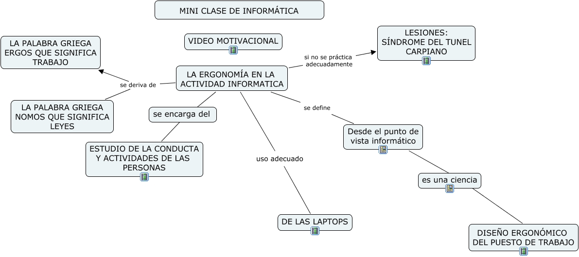 Este Cmap, tiene información relacionada con: Ergonomia3, LA ERGONOMÍA EN LA ACTIVIDAD INFORMATICA ???? ESTUDIO DE LA CONDUCTA Y ACTIVIDADES DE LAS PERSONAS, LA ERGONOMÍA EN LA ACTIVIDAD INFORMATICA se deriva de LA PALABRA GRIEGA NOMOS QUE SIGNIFICA LEYES, Desde el punto de vista informático ???? DISEÑO ERGONÓMICO DEL PUESTO DE TRABAJO, LA ERGONOMÍA EN LA ACTIVIDAD INFORMATICA se define Desde el punto de vista informático, LA ERGONOMÍA EN LA ACTIVIDAD INFORMATICA uso adecuado DE LAS LAPTOPS, LA ERGONOMÍA EN LA ACTIVIDAD INFORMATICA si no se práctica adecuadamente LESIONES: SÍNDROME DEL TUNEL CARPIANO, LA ERGONOMÍA EN LA ACTIVIDAD INFORMATICA se deriva de LA PALABRA GRIEGA ERGOS QUE SIGNIFICA TRABAJO