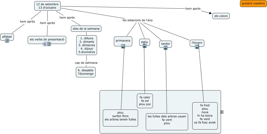 This Concept Map, created with IHMC CmapTools, has information related to: el primer mes, 12 de setembre 13 d'octubre les estacions de l'any primavera, 12 de setembre 13 d'octubre hem après dies de la setmana, fa calor fa sol plou poc ???? estiu, dies de la setmana ???? 1. dilluns 2. dimarts 3. dimecres 4. dijous 5.divendres, fa calor fa sol plou poc ???? estiu, fa calor fa sol plou poc ???? estiu, 12 de setembre 13 d'octubre les estacions de l'any tardor, 12 de setembre 13 d'octubre hem après els verbs de presentació, fa calor fa sol plou poc ???? estiu, 12 de setembre 13 d'octubre les estacions de l'any estiu, 12 de setembre 13 d'octubre hem après alfabet, 12 de setembre 13 d'octubre hem après els colors, l'hivern ???? fa fred plou neva hi ha boira fa vent es fa fosc aviat, fa calor fa sol plou poc ???? estiu, primavera ???? plou surten flors els arbres tenen fulles, 1. dilluns 2. dimarts 3. dimecres 4. dijous 5.divendres cap de setmana 6. dissabte 7diumenge, tardor ???? les fulles dels arbres cauen fa vent plou, 12 de setembre 13 d'octubre les estacions de l'any l'hivern