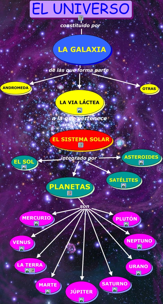 Este Cmap, tiene información relacionada con: El universo, PLANETAS son SATURNO, PLANETAS son VENUS, PLANETAS son MARTE, EL SISTEMA SOLAR integrado por ASTEROIDES, LA GALAXIA de las que forma parte OTRAS, EL UNIVERSO constituido por LA GALAXIA, PLANETAS son MERCURIO, PLANETAS son PLUTÓN, PLANETAS son LA TERRA, LA GALAXIA de las que forma parte LA VIA LÁCTEA, EL SISTEMA SOLAR integrado por PLANETAS, EL SISTEMA SOLAR integrado por SATÉLITES, PLANETAS son NEPTUNO, EL SISTEMA SOLAR integrado por EL SOL, LA GALAXIA de las que forma parte ANDROMEDA, PLANETAS son JÚPITER, PLANETAS son URANO, LA VIA LÁCTEA a la que pertenece EL SISTEMA SOLAR