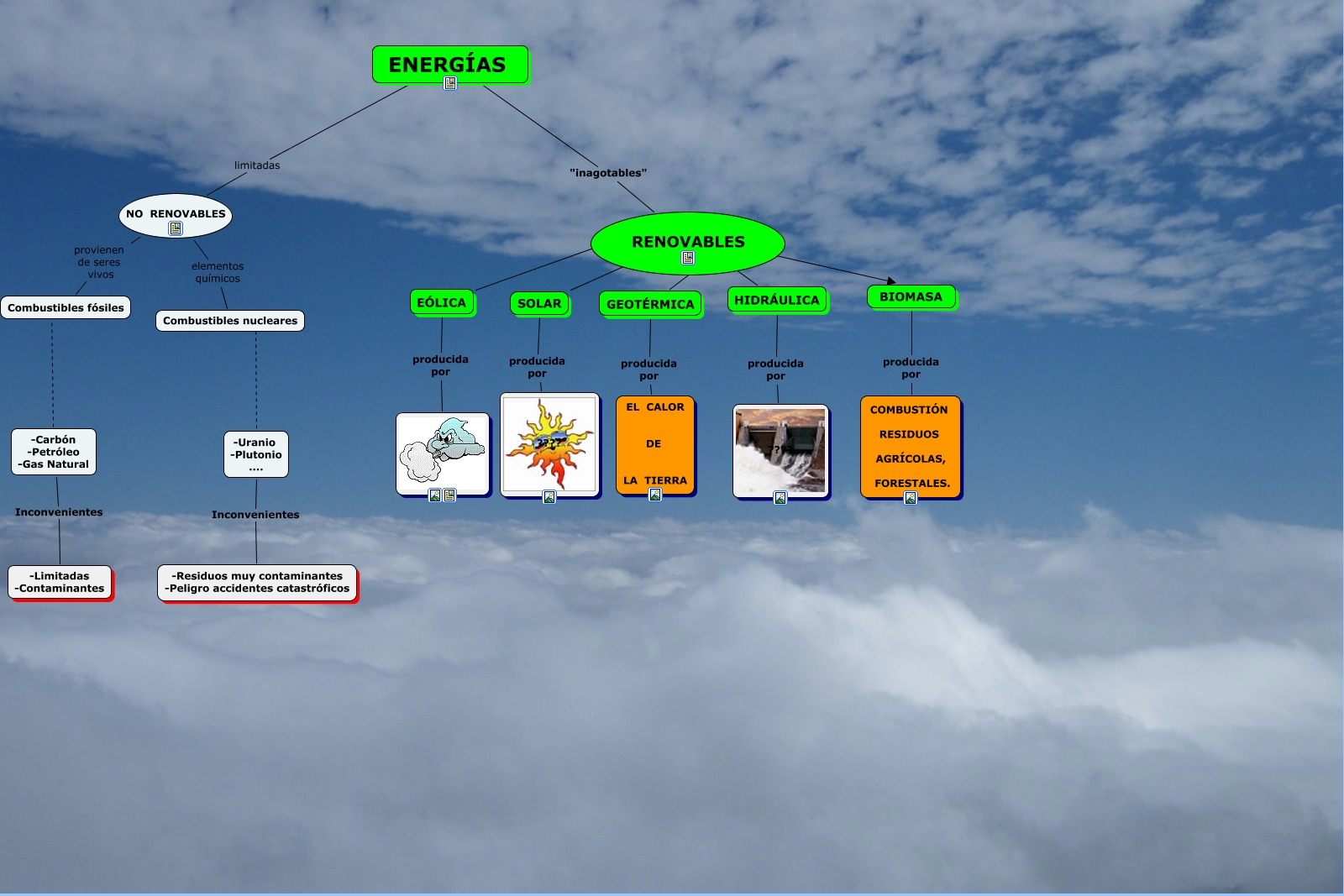 Este mapa conceptual tiene información relacionada a: energías, NO RENOVABLES provienen de seres vivos Combustibles fósiles, ENERGÍAS limitadas NO RENOVABLES, Combustibles nucleares ???? -Uranio -Plutonio ...., BIOMASA producida por COMBUSTIÓN RESIDUOS AGRÍCOLAS, FORESTALES., RENOVABLES ???? SOLAR, HIDRÁULICA producida por ????, EÓLICA producida por , GEOTÉRMICA producida por EL CALOR DE LA TIERRA, -Uranio -Plutonio .... Inconvenientes -Residuos muy contaminantes -Peligro accidentes catastróficos, RENOVABLES ???? GEOTÉRMICA