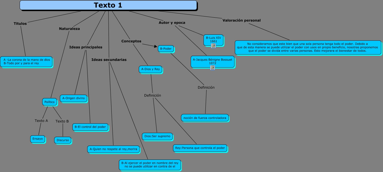 Este Cmap, tiene información relacionada con: Documento 1, Texto 1 Ideas principales A-Origen divino, Texto 1 Valoración personal No consideramos que este bien que una sola persona tenga todo el poder. Debido a que de esta manera se puede utilizar el poder con usos en propio beneficio, nosotras proponemos que el poder se divida entre varias personas. Esto mejorara el bienestar de todos., Texto 1 Ideas secundarias B-Al ejercer el poder en nombre del rey no se puede utilizar en contra de el, A-Dios y Rey Definición Dios:Ser supremo, Texto 1 Conceptos B-Poder, Texto 1 Naturaleza Político, Político Texto B Discurso, A-Dios y Rey Definición Rey:Persona que controla el poder, Texto 1 Conceptos A-Dios y Rey, Texto 1 Ideas secundarias A-Quien no respete al rey,morira, Político Texto A Ensayo, Texto 1 Autor y epoca A-Jacques Bénigne Bossuet 1072, Texto 1 Ideas principales B-El control del poder, B-Poder Definición noción de fuerza controladora, Texto 1 Titulos A -La corona de la mano de dios B-Todo por y para el rey, Texto 1 Autor y epoca B-Luis XIV 1661