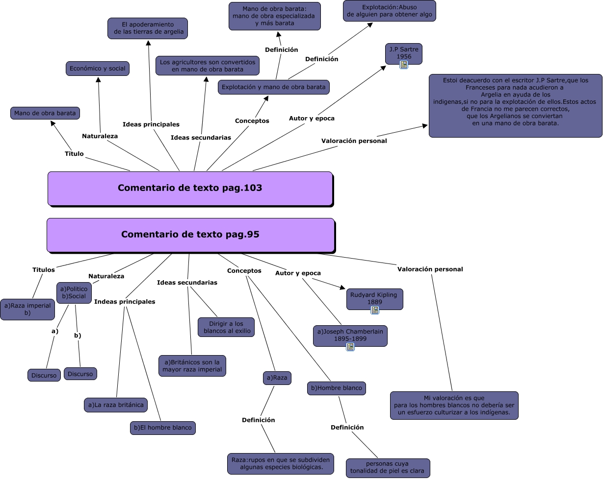 Este Cmap, tiene información relacionada con: Comentarios de texto, Comentario de texto pag.95 Indeas principales a)La raza británica, Comentario de texto pag.95 Autor y epoca a)Joseph Chamberlain 1895-1899, Comentario de texto pag.95 Ideas secundarias Dirigir a los blancos al exilio, Comentario de texto pag.103 Autor y epoca J.P Sartre 1956, b)Hombre blanco Definición personas cuya tonalidad de piel es clara, Comentario de texto pag.103 Conceptos Explotación y mano de obra barata, Comentario de texto pag.95 Autor y epoca Rudyard Kipling 1889, Comentario de texto pag.95 Conceptos b)Hombre blanco, a)Politico b)Social b) Discurso, Comentario de texto pag.95 Naturaleza a)Politico b)Social, Explotación y mano de obra barata Definición Mano de obra barata: mano de obra especializada y más barata, Comentario de texto pag.103 Titulo Mano de obra barata, a)Raza Definición Raza:rupos en que se subdividen algunas especies biológicas., Comentario de texto pag.95 Indeas principales b)El hombre blanco, Comentario de texto pag.103 Naturaleza Económico y social, Comentario de texto pag.103 Ideas principales El apoderamiento de las tierras de argelia, Comentario de texto pag.103 Ideas secundarias Los agricultores son convertidos en mano de obra barata, a)Politico b)Social a) Discurso, Explotación y mano de obra barata Definición Explotación:Abuso de alguien para obtener algo, Comentario de texto pag.95 Valoración personal Mi valoración es que para los hombres blancos no debería ser un esfuerzo culturizar a los indígenas.