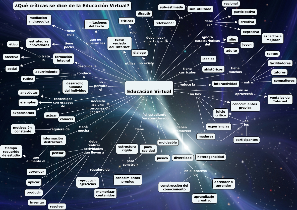 Este Cmap, tiene información relacionada con: criticas de la educación virtual, Educacion Virtual contenidos con escases de ejemplos, información distractora que aumenta el tiempo requerido de estudio, Educacion Virtual necesita de una interconexión entre el actuar, Educacion Virtual deben promoveer diversidad, Educacion Virtual es sub-utilizada, Educacion Virtual conduce a aburrimiento, Educacion Virtual ignora características del niño, Educacion Virtual no hay conocimientos previos, Educacion Virtual el estudiante es considerado moldeable, Educacion Virtual debe realizar actividades que lleven a resolver, Educacion Virtual conduce a rutina, Educacion Virtual requiere de reproducir ejercicios, texto vaciado del Internet que no superan las limitaciones del texto, Educacion Virtual contenidos con escases de anecdotas, conocimientos previos de los madurez, Educacion Virtual tiene estructura rígida, Educacion Virtual debe ser creativa, interactividad entre tutores, Educacion Virtual reduce la interactividad, Educacion Virtual es sub-estimada