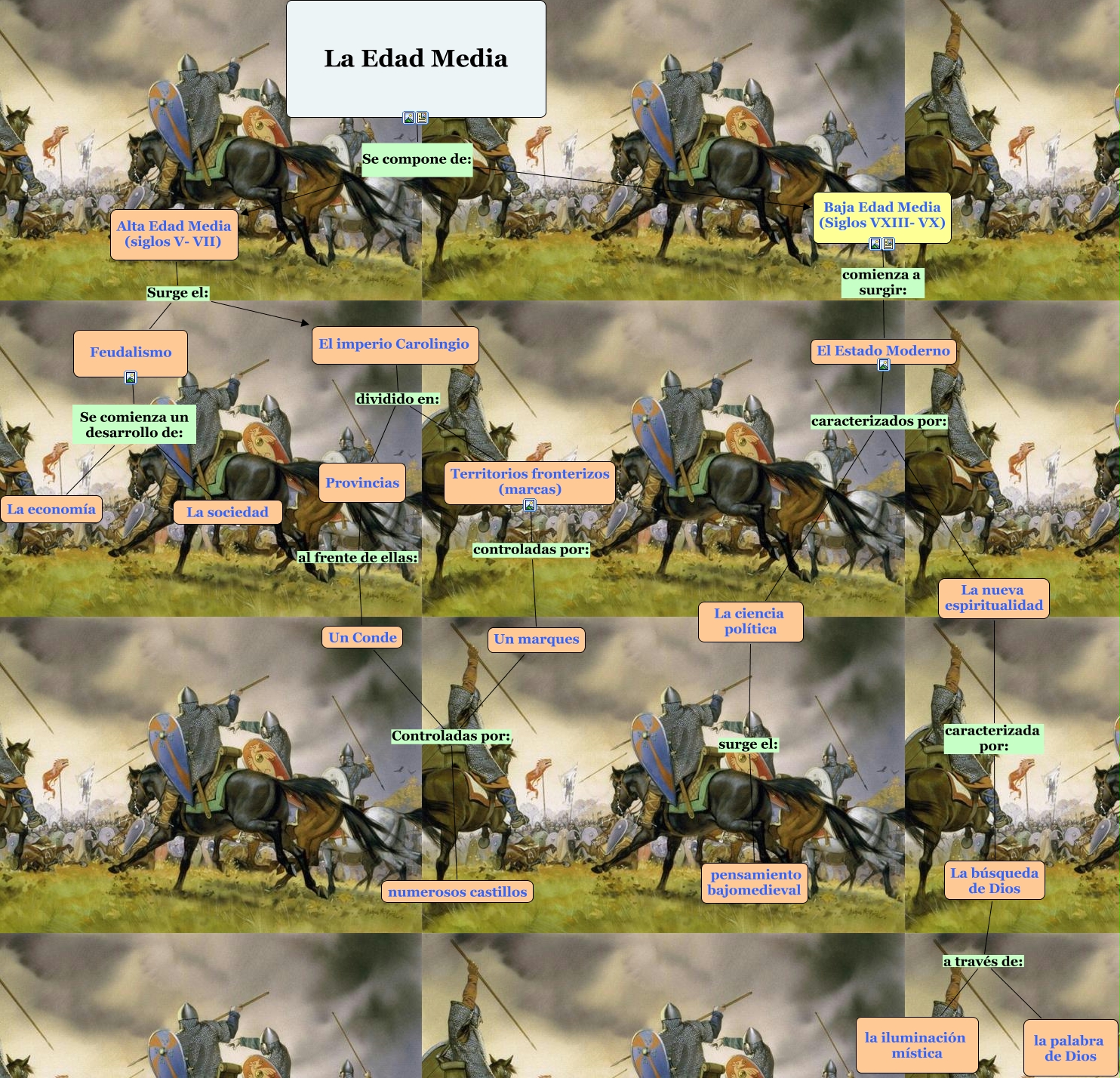 Este Cmap, tiene información relacionada con: edad media, La búsqueda de Dios a través de: la iluminación mística, El imperio Carolingio dividido en: Territorios fronterizos (marcas), El Estado Moderno caracterizados por: La nueva espiritualidad, Alta Edad Media (siglos V- VII) Surge el: Feudalismo, El Estado Moderno caracterizados por: La ciencia política, Territorios fronterizos (marcas) controladas por: Un marques, La búsqueda de Dios a través de: la palabra de Dios, Baja Edad Media (Siglos VXIII- VX) comienza a surgir: El Estado Moderno, Alta Edad Media (siglos V- VII) Surge el: El imperio Carolingio, Provincias al frente de ellas: Un Conde, La ciencia política surge el: pensamiento bajomedieval, La Edad Media Se compone de: Baja Edad Media (Siglos VXIII- VX), La nueva espiritualidad caracterizada por: La búsqueda de Dios, Un Conde Controladas por: numerosos castillos, Un marques Controladas por: numerosos castillos, La Edad Media Se compone de: Alta Edad Media (siglos V- VII), Feudalismo Se comienza un desarrollo de: La economía, Feudalismo Se comienza un desarrollo de: La sociedad, El imperio Carolingio dividido en: Provincias